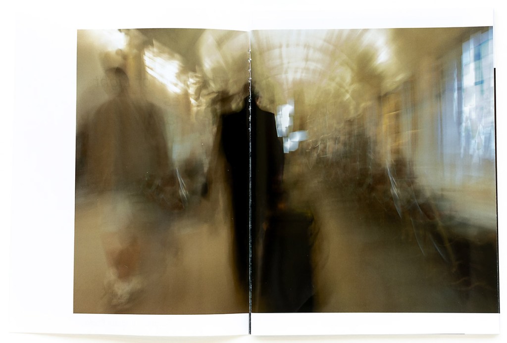 The first image sharing the two-page spread with the interior title page depicts an individual–not quite a silhouette- (we infer it’s Stockdale) walking away from us down a hallway of a hotel. Bare walls with only the cast of light creating repeating patterns of light and shadow-symmetrical in a non-welcoming way. An initializing image–an equivalent of the book’s title perhaps. The first full image-as it crosses the gutter almost a full bleed of two pages, is where the real action begins in earnest. If a singular image could encapsulate the idea of travel related anxiety, it’s this one. A muted ochre color palette paints the environment of the airport terminal as if straight out of a late 19th century impressionist painting, only lacking in romanticist appeal. Stockdale employs a slow shutter speed and an out of focus view to create a scene of hyper kinetic activity. Again, placed at the center where the pages meet-providing a focal point-a figure– back facing us as he walks away carry-on luggage in tow. Although meant to evoke anxiety, it has its own aesthetic appeal, Stockdale is able to exploit the beauty the medium offers.