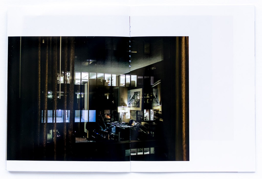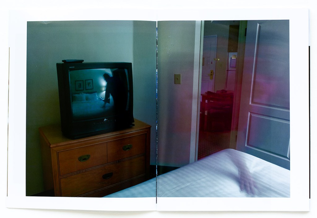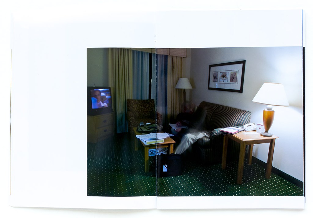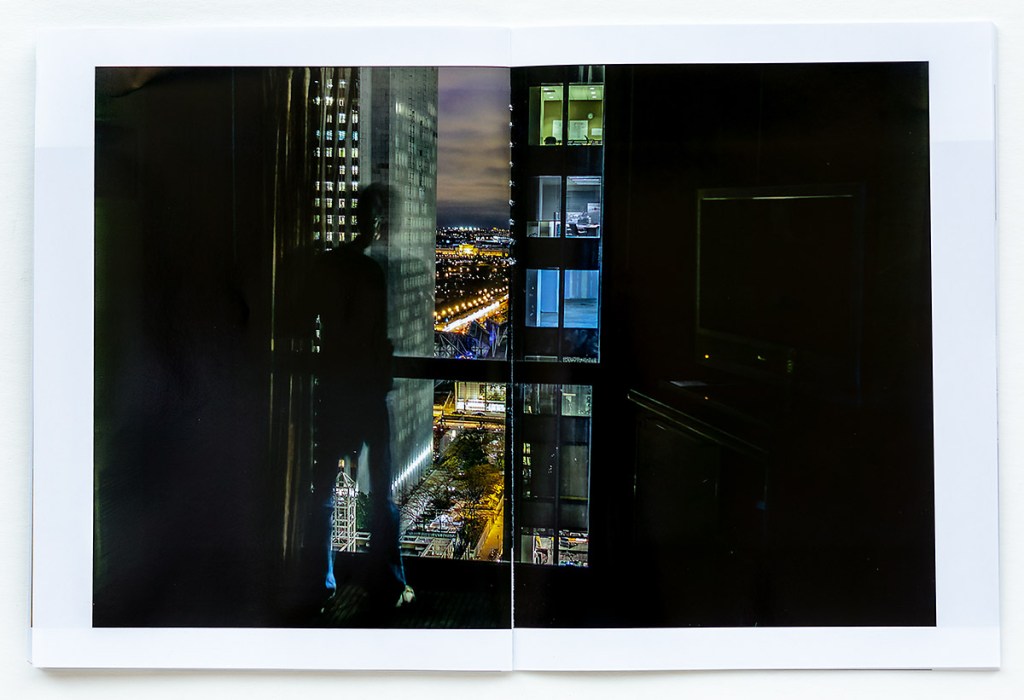 Nowhere in The Flow of Light Brushes the Shadow is it depicted better than in the gatefold images located in the middle of the book. Perfectly staged to produce the idea of dislocation and manifesting as a psychological casualty. Spanning four pages in total, it’s clever in its execution. When reaching the center point of The Flow of Light Brushes the Shadow, there is one nighttime image of a downtown bathed in the blue light of dawn. But unlike the rest of the pages, here the edge meets in the middle. The reader is therefore compelled to open the two pages outward, revealing the four-page spread. His hotel room serving as an ad-hoc office while away on assignment. He lays out his clothes as if occupying his desk chair with his laptop at the ready. As uninviting as a scenario can be. Here is where Tension in the Air (Stockdale’s afterword) is crystallized–certainly some of the more salient points where he cites feelings of alienation, apprehension, melancholy and isolation.
