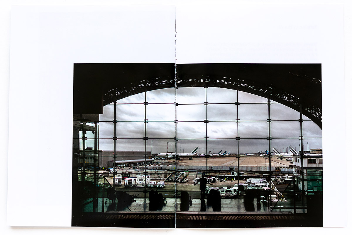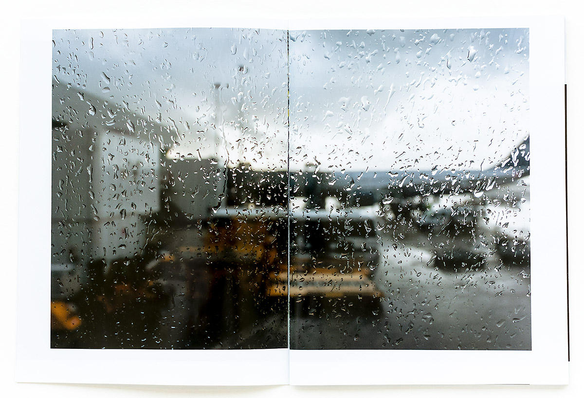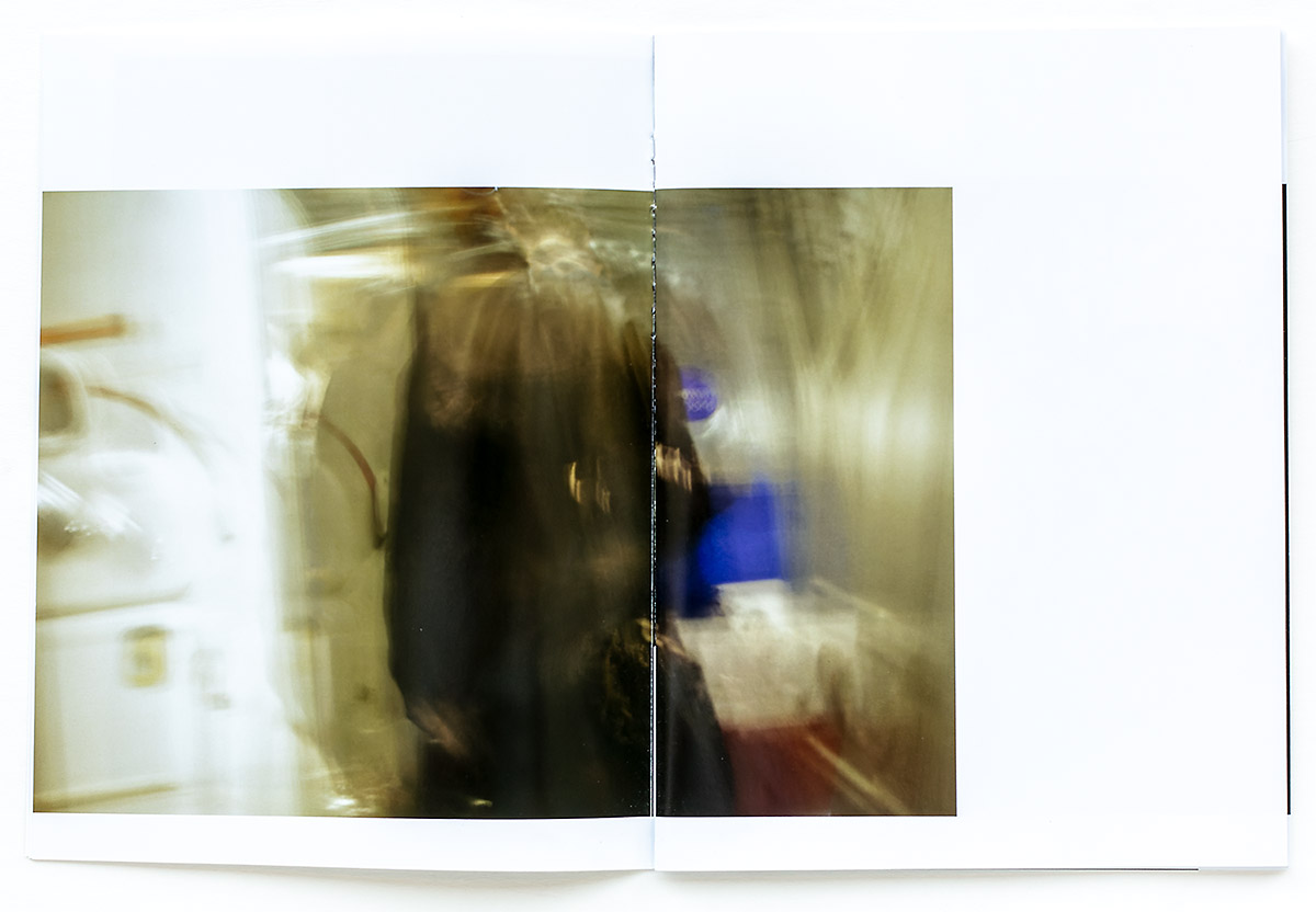 The first image sharing the two-page spread with the interior title page depicts an individual–not quite a silhouette- (we infer it’s Stockdale) walking away from us down a hallway of a hotel. Bare walls with only the cast of light creating repeating patterns of light and shadow-symmetrical in a non-welcoming way. An initializing image–an equivalent of the book’s title perhaps. The first full image-as it crosses the gutter almost a full bleed of two pages, is where the real action begins in earnest. If a singular image could encapsulate the idea of travel related anxiety, it’s this one. A muted ochre color palette paints the environment of the airport terminal as if straight out of a late 19th century impressionist painting, only lacking in romanticist appeal. Stockdale employs a slow shutter speed and an out of focus view to create a scene of hyper kinetic activity. Again, placed at the center where the pages meet-providing a focal point-a figure– back facing us as he walks away carry-on luggage in tow. Although meant to evoke anxiety, it has its own aesthetic appeal, Stockdale is able to exploit the beauty the medium offers.
