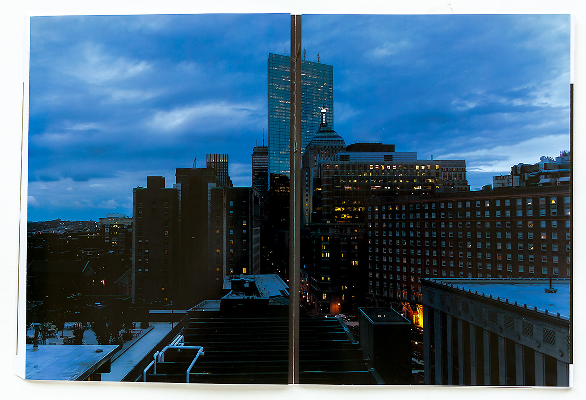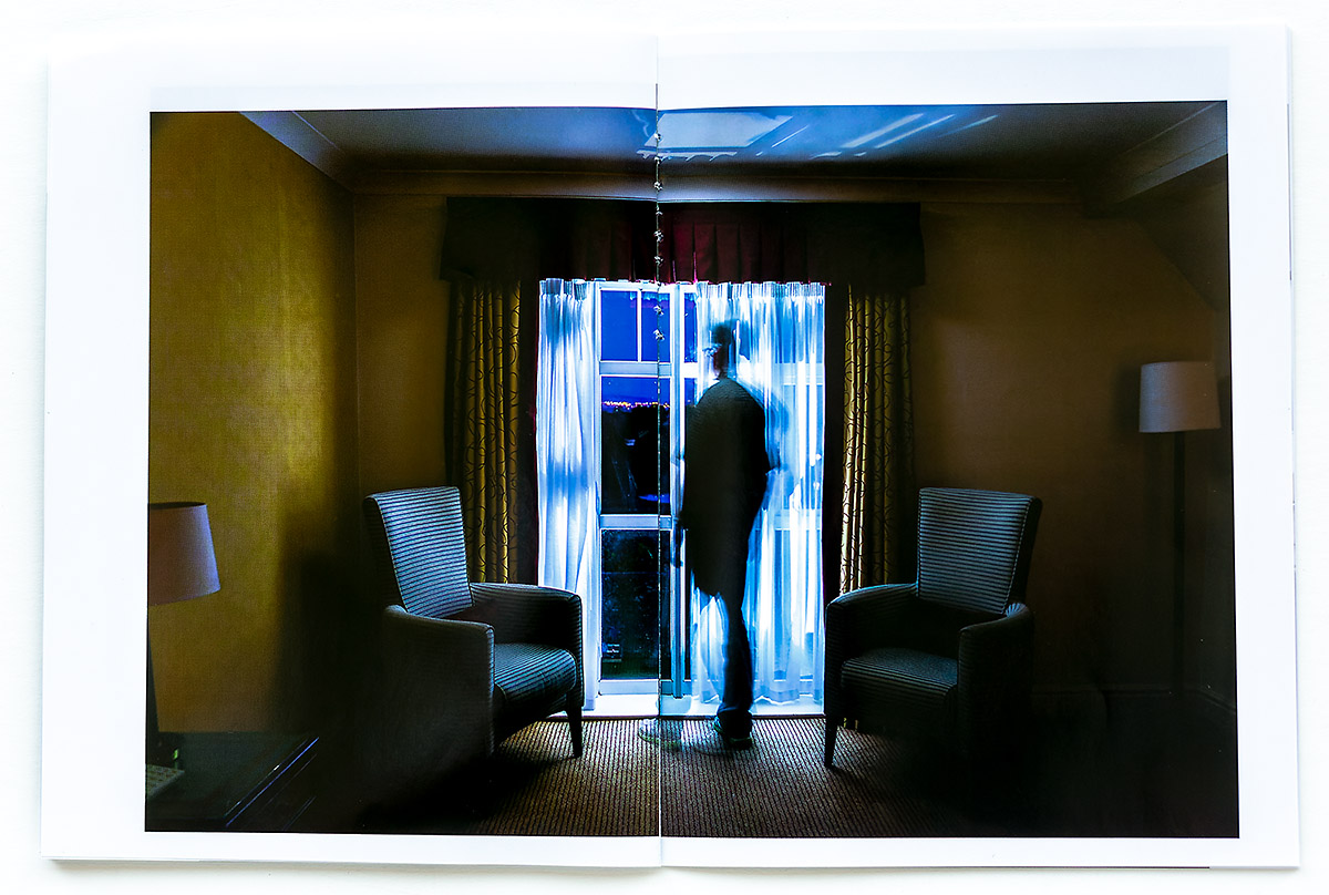 Nowhere in The Flow of Light Brushes the Shadow is it depicted better than in the gatefold images located in the middle of the book. Perfectly staged to produce the idea of dislocation and manifesting as a psychological casualty. Spanning four pages in total, it’s clever in its execution. When reaching the center point of The Flow of Light Brushes the Shadow, there is one nighttime image of a downtown bathed in the blue light of dawn. But unlike the rest of the pages, here the edge meets in the middle. The reader is therefore compelled to open the two pages outward, revealing the four-page spread. His hotel room serving as an ad-hoc office while away on assignment. He lays out his clothes as if occupying his desk chair with his laptop at the ready. As uninviting as a scenario can be. Here is where Tension in the Air (Stockdale’s afterword) is crystallized–certainly some of the more salient points where he cites feelings of alienation, apprehension, melancholy and isolation.