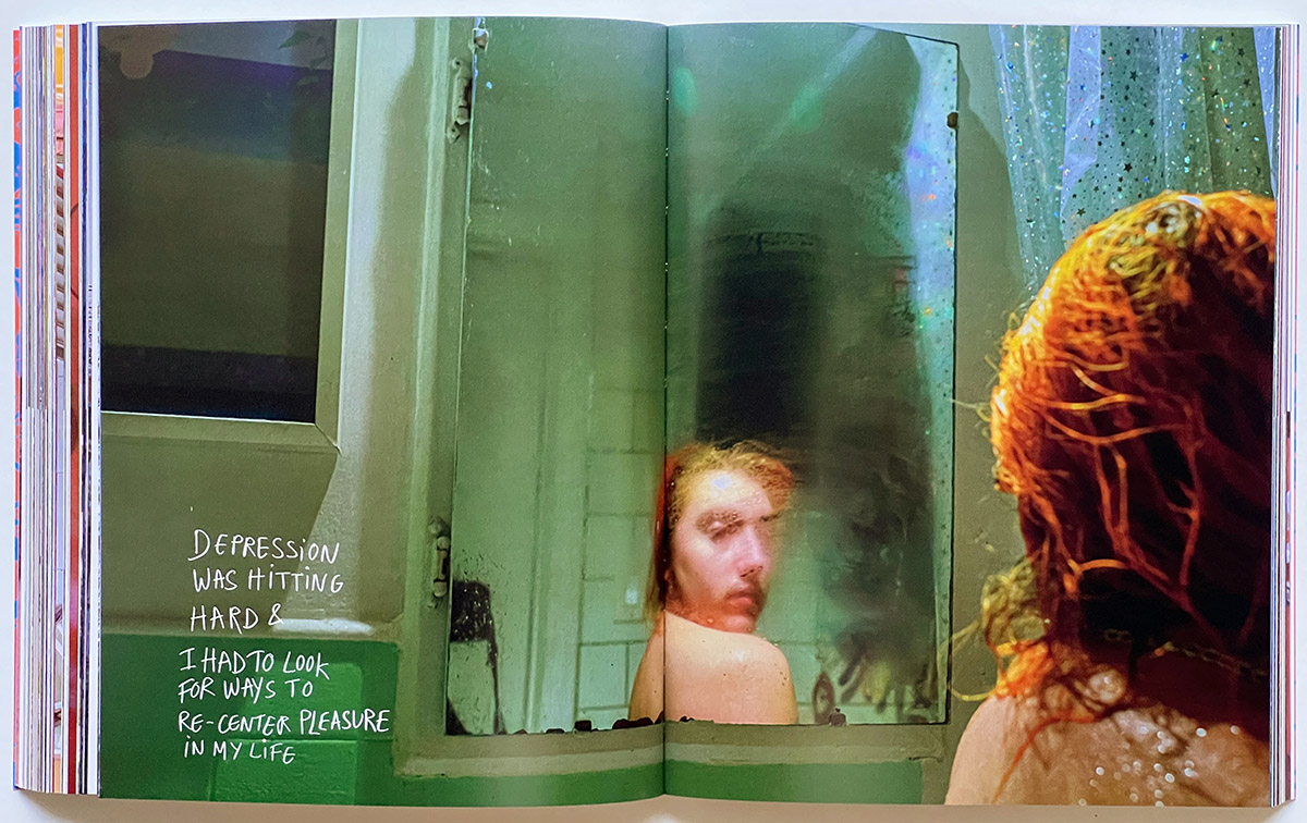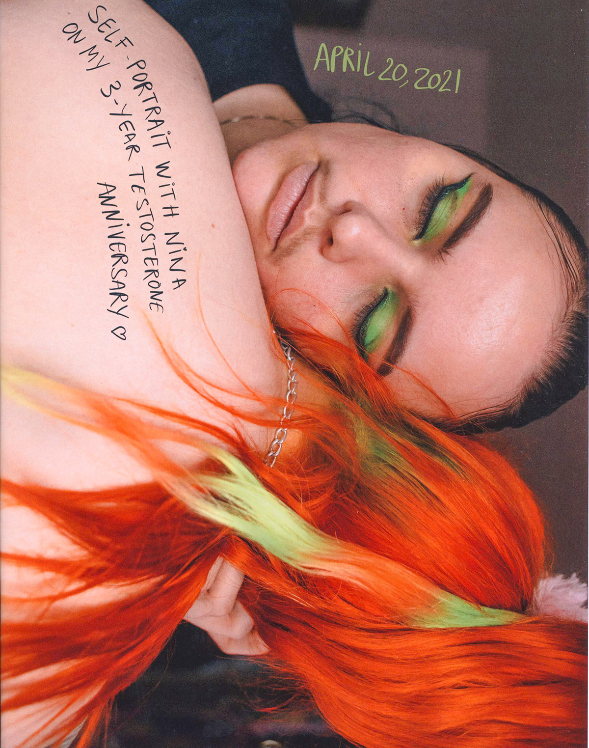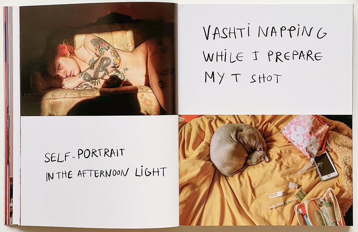 So it is with this refreshingly direct and creatively presented new photobook by Laurence Philomène, also known as Larry, in which we share a special journey over a period of three years. Larry, who identifies as trans, queer, and non-binary, provides many details about various developments and moments that took place during that time. We are privileged find out about a myriad of personal feelings, the process of supplementary testosterone shots, some trips, and we also get to know a group of friends, who function as a very important support group.