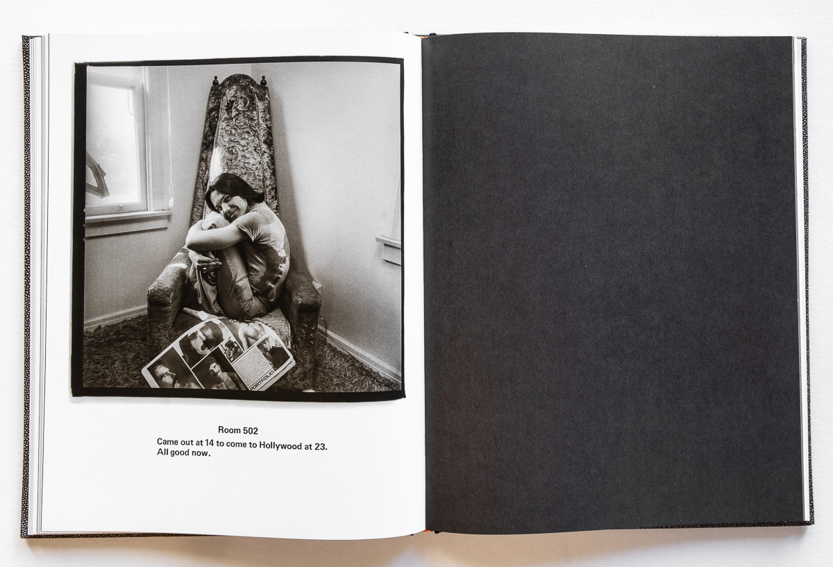 The design of the book mimics a classic hotel register, with a pebbled cover followed by end pages showing the sign-in pages from actual St. Francis hotel ledgers. The images are presented one to a spread on oversized pages, set off by black borders and a black facing page. They progress from the empty 1st-floor room of a former Hollywood stunt man who died the night before Wolin was scheduled to make his portrait, up to the room of the writer in the 5th-floor penthouse.