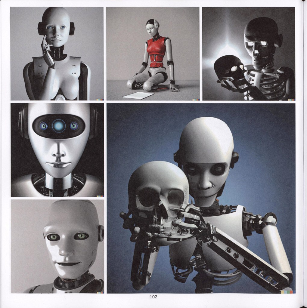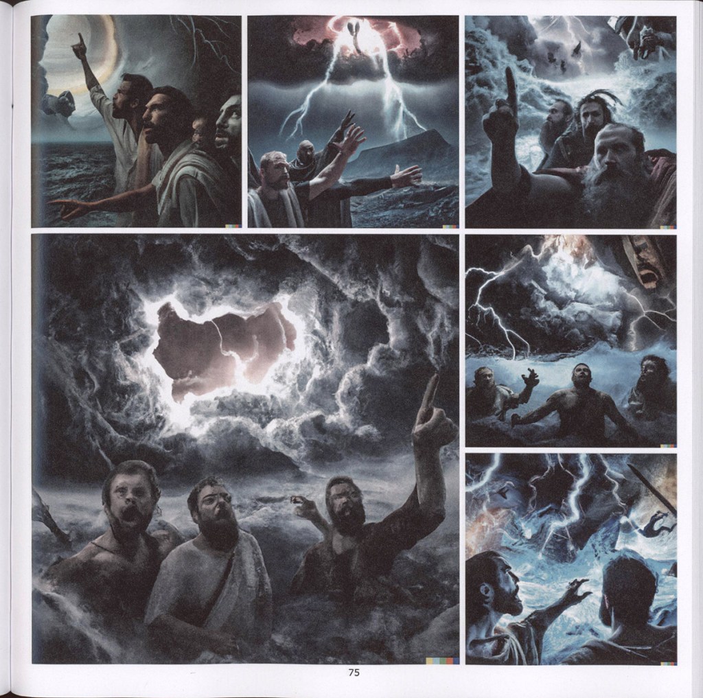 To look at such images of creation, made possible by machine-supported, often surprising recombinations, is a moving and overwhelming experience for the viewer. What would the ancient past have looked like if there had been cameras to take pictures? What will future generations see when they record innovations that are yet to come? Knappe presents us with nearly 600 images in collage-like arrangements to stimulate our curiosity. That layout creates many mysterious moods through effective groupings, though some of the images would have also been stunning by themselves on a full page. These photo-like images certainly look like photographs; some could be upscaled to be exhibited in galleries as prints, similar to images previously considered “art.” Others are in the realm of photodocumentary representations, even though what is depicted is not a true document, but rather a journey of human imagination, myths, and theories, facilitated by increasingly clever machines.