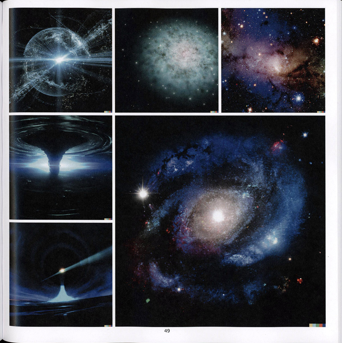 Jens Knappe, who has a computer-supported photo agency in Berlin as well as other experience in self-enhancing machine-support systems, was lucky to be one of the early experimental testers of DALL·E 2 earlier this year. Being a person who is well familiar with computer-supported endeavors, he immediately understood that this was “a milestone of epochal proportions,” best suited for visualizing a subject involving an extensive journey of the imagination, and dealing with ideas that mostly cannot be photographed in the real world. Thus he chose the creation and creativity of our universe, both past and future, as the subject to be imagined and imaged. The result is this wonderful photo book, the first of its kind to be based on such complex ideas serving as input to a machine-based compendium of human experience, with new images as the output which result in a very comprehensive visualization. His subtitle is A Creation Story in Collaboration with an Artificial Intelligence.