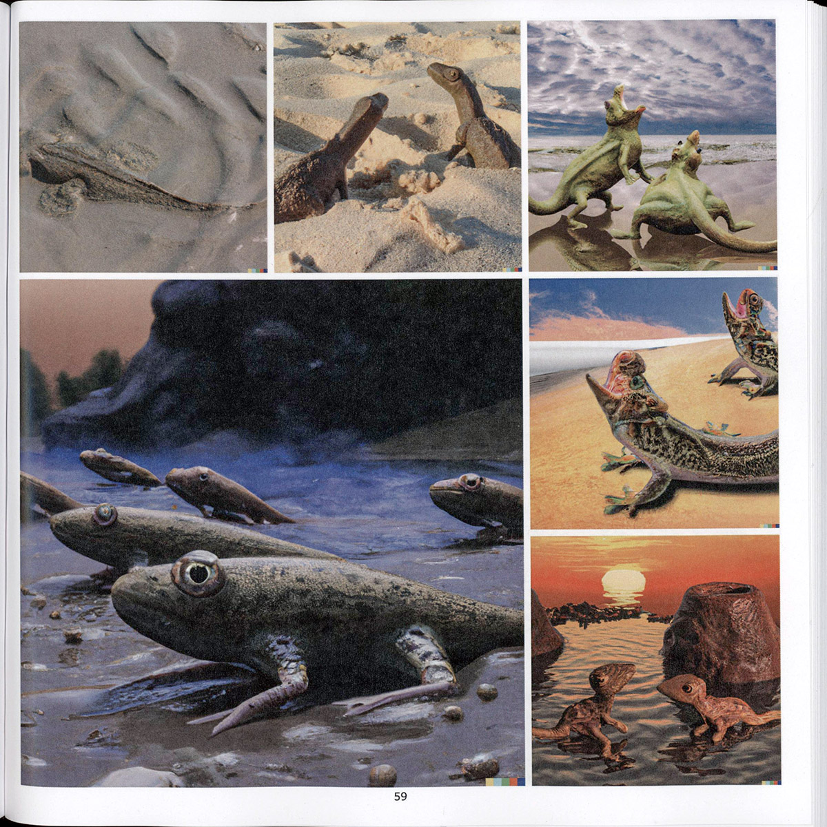To look at such images of creation, made possible by machine-supported, often surprising recombinations, is a moving and overwhelming experience for the viewer. What would the ancient past have looked like if there had been cameras to take pictures? What will future generations see when they record innovations that are yet to come? Knappe presents us with nearly 600 images in collage-like arrangements to stimulate our curiosity. That layout creates many mysterious moods through effective groupings, though some of the images would have also been stunning by themselves on a full page. These photo-like images certainly look like photographs; some could be upscaled to be exhibited in galleries as prints, similar to images previously considered “art.” Others are in the realm of photodocumentary representations, even though what is depicted is not a true document, but rather a journey of human imagination, myths, and theories, facilitated by increasingly clever machines.