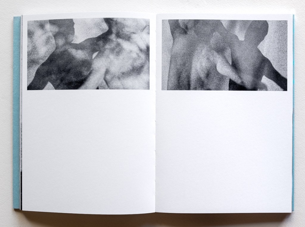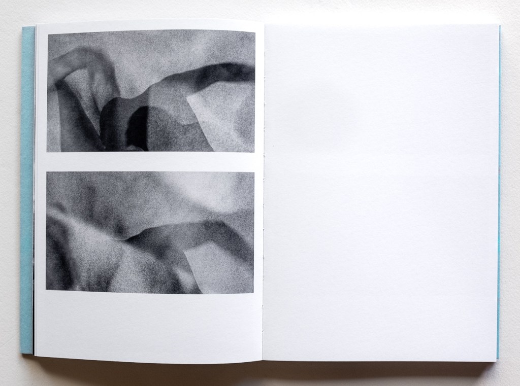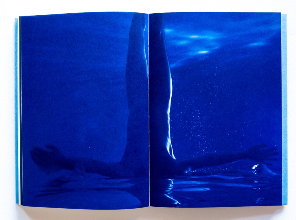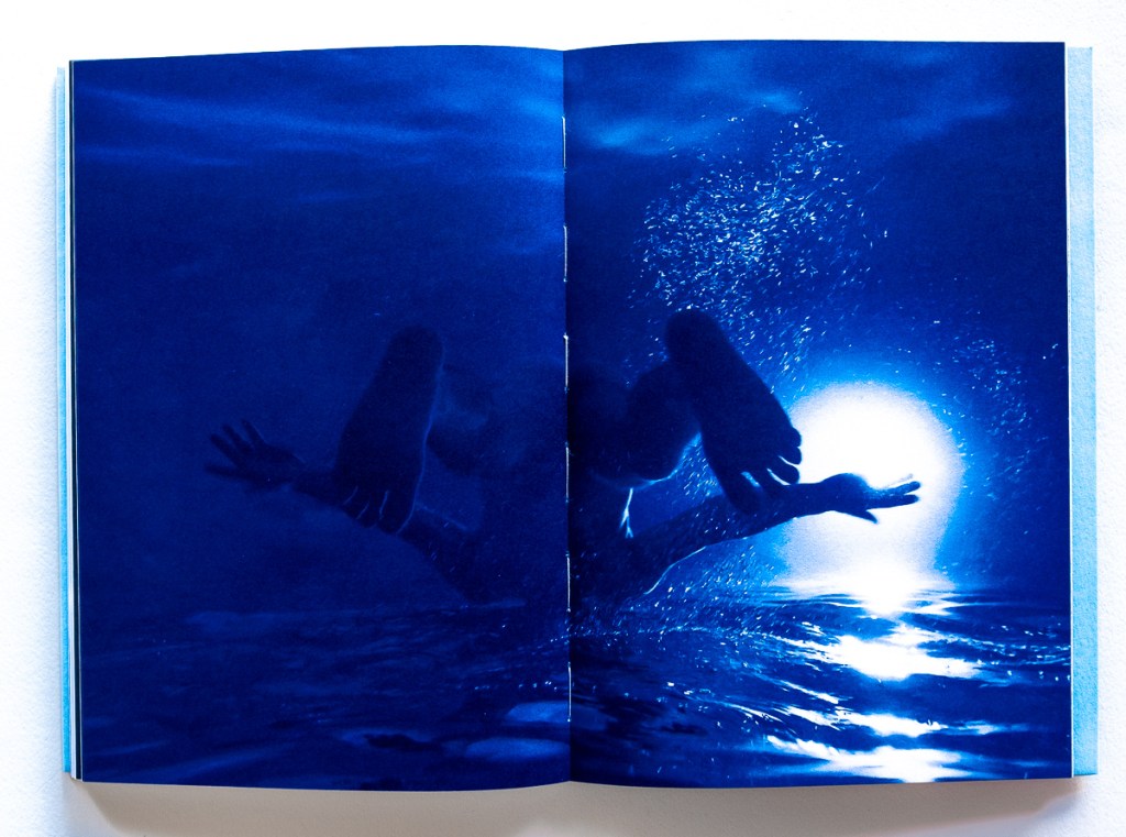 The book begins with aerial images that set the location of the lake. Then we see Fodoreanu’s childhood photos taken on the surface of the lake, now faded and distressed, combined with recent photos of human bodies fragmented by underwater light and shadows. As we dive deeper, we see a series of deep-blue-toned images of a diver descending to the depths. Finally, we see a series of grainy, indistinct images, as if we’re struggling to make out what’s at the bottom of the lake.