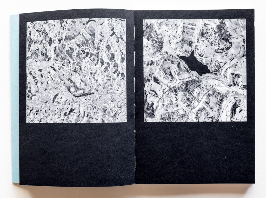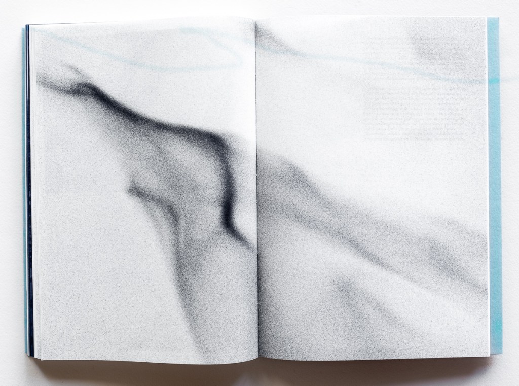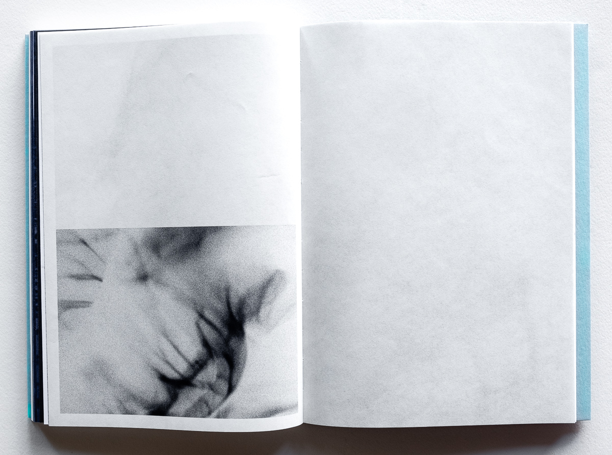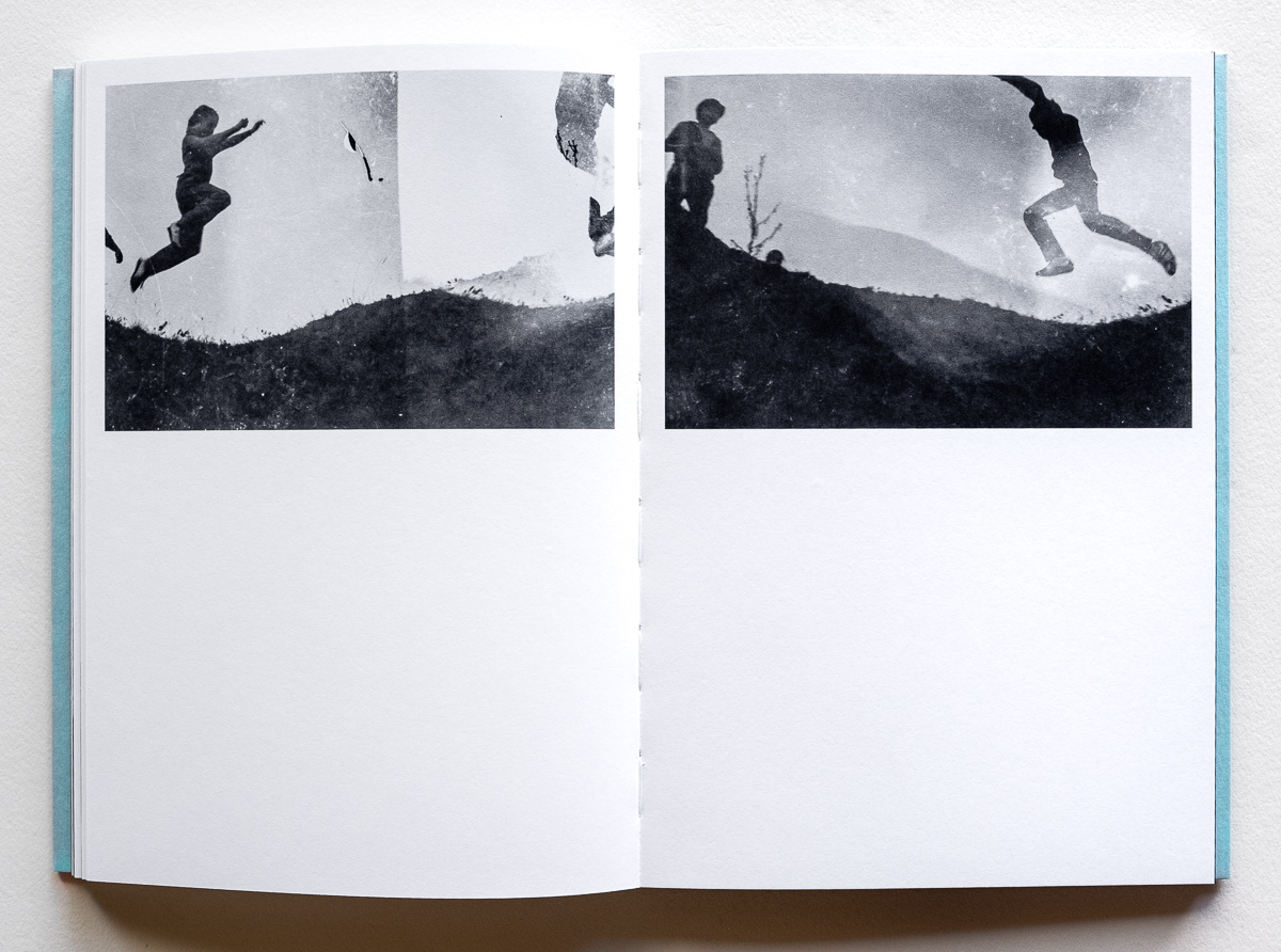 The book begins with aerial images that set the location of the lake. Then we see Fodoreanu’s childhood photos taken on the surface of the lake, now faded and distressed, combined with recent photos of human bodies fragmented by underwater light and shadows. As we dive deeper, we see a series of deep-blue-toned images of a diver descending to the depths. Finally, we see a series of grainy, indistinct images, as if we’re struggling to make out what’s at the bottom of the lake.