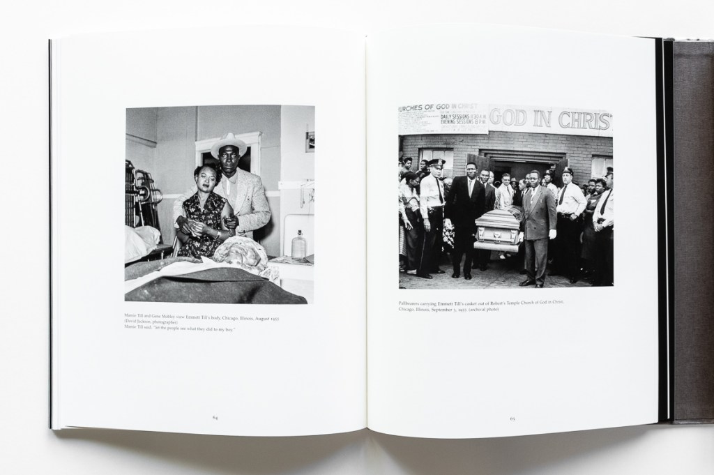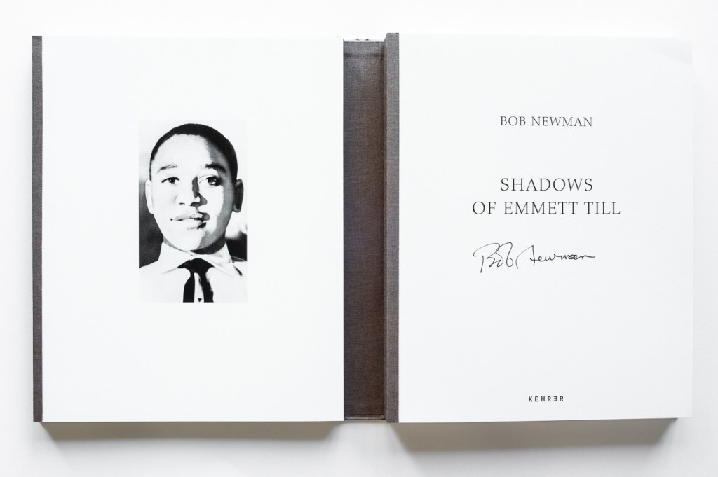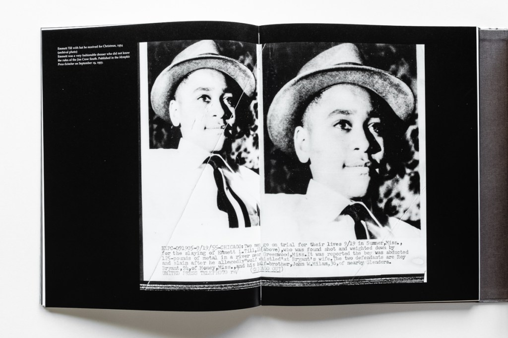 It’s actually two books in one, featuring separate book blocks attached to the inside of the front and back covers. The first book block provides a history lesson on the murder of Till and race relations in the South from the 1930s to the present. “Before one can engage with the ways that Emmett Till continues to cast a shadow over the great alluvial plain known as the Delta, one must first glimpse into the past reality that still haunts that landscape,” Newman writes.