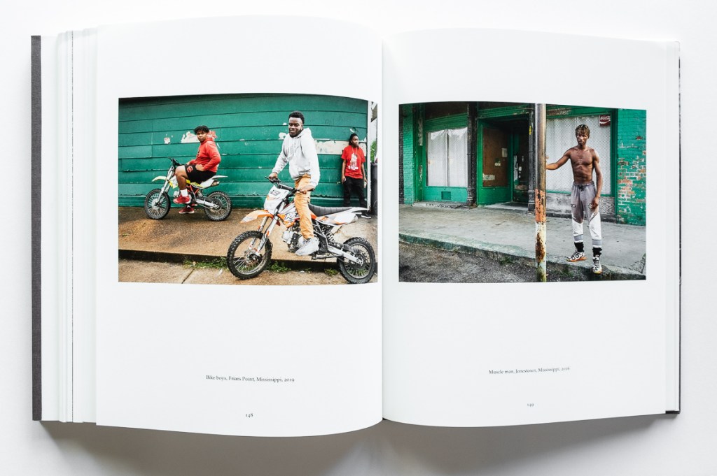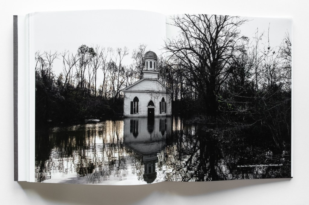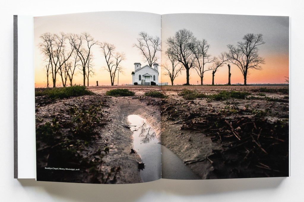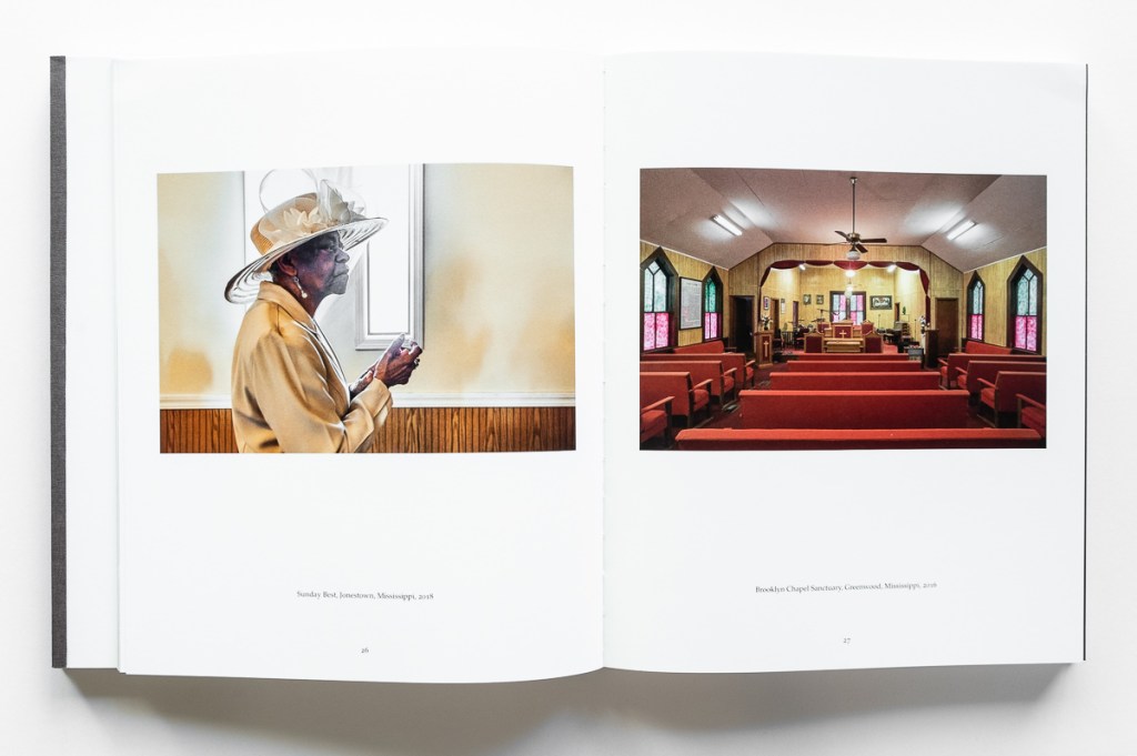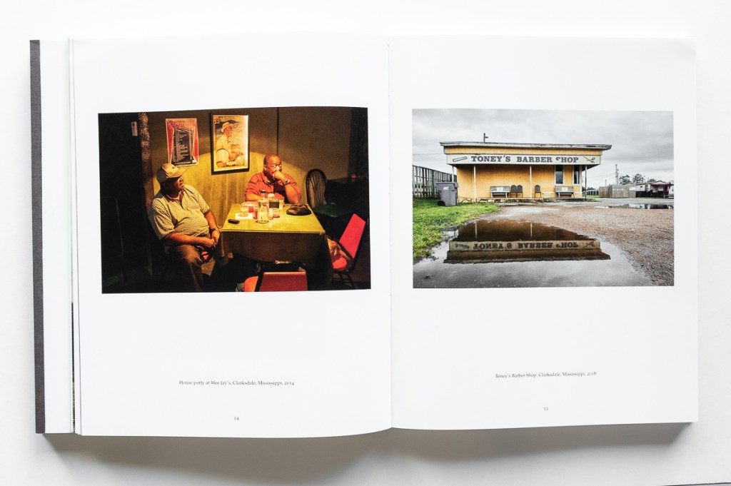 The second book block presents Newman’s look at 21st century life in the Delta. In contrast to the gritty, often grim, black-and-white historical images, Newman offers lush color photos of today’s Delta, supported by perceptive essays and poetry. We see classically composed images of the landscape — flat, green, and often wet. We see the plain, weathered homes, churches, and buildings. We see the people — black and white — at home, at work, and at play. We go inside their houses, churches, stores, bars, and pool halls. We see the ruins of the grocery store where Till’s encounter with a white woman led to his death. And we see the Black Bayou Bridge from which his mutilated body was thrown into the Tallahatchie River. Altogether we see scenes of the joy, sorrow, and poverty of Delta life.