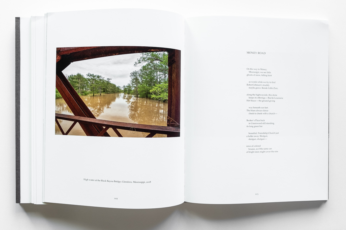 The second book block presents Newman’s look at 21st century life in the Delta. In contrast to the gritty, often grim, black-and-white historical images, Newman offers lush color photos of today’s Delta, supported by perceptive essays and poetry. We see classically composed images of the landscape — flat, green, and often wet. We see the plain, weathered homes, churches, and buildings. We see the people — black and white — at home, at work, and at play. We go inside their houses, churches, stores, bars, and pool halls. We see the ruins of the grocery store where Till’s encounter with a white woman led to his death. And we see the Black Bayou Bridge from which his mutilated body was thrown into the Tallahatchie River. Altogether we see scenes of the joy, sorrow, and poverty of Delta life.