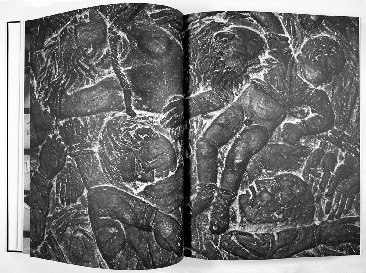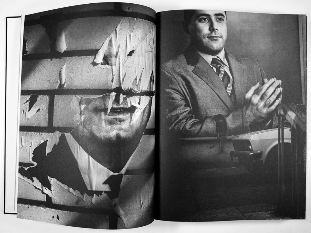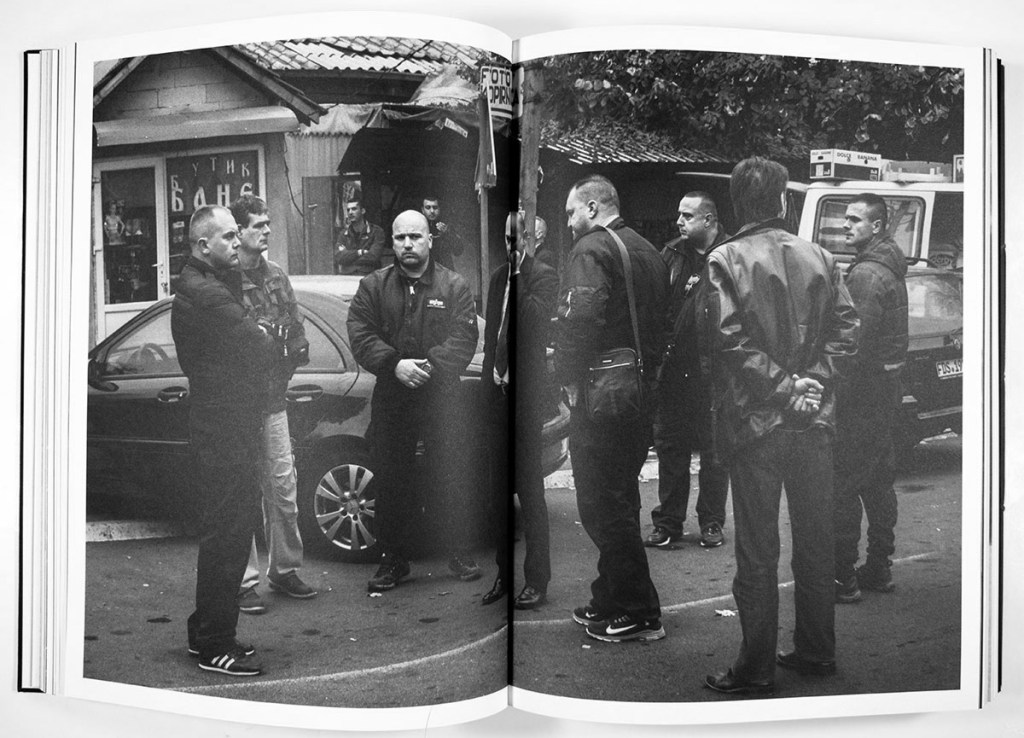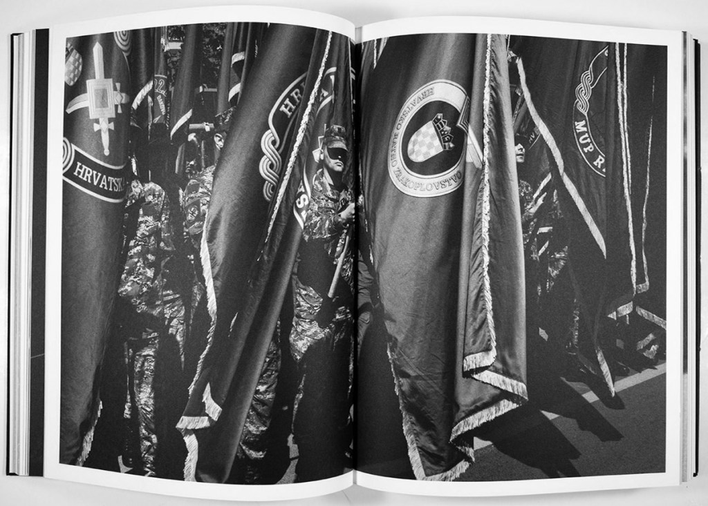 While it is always risky to accept an artist’s statements about their own work at face value, Kuzmanovic’s framing of this work confirmed my own experience in engaging with these photographs and reading these signs as I traveled the road Kuzmanovic offers. These images, organized in “three picture cycles” – according to Kuzmanovic – covering a period of almost 30 years, are in the aggregate, overwhelming. All black and white, the photographs are presented as full double-page bleeds, double-page spreads with a thin app. 1/4” border, some single page, bordered images, half-page diptychs across facing pages and, beginning about halfway through the book, four double-page foldouts. Within the foldouts are grids presenting 21 smaller images of: crowds; faces of pedestrians; uniformed parade marchers; and parade viewers. The overall sense is of a deliberateness and precision of organization and presentation.
