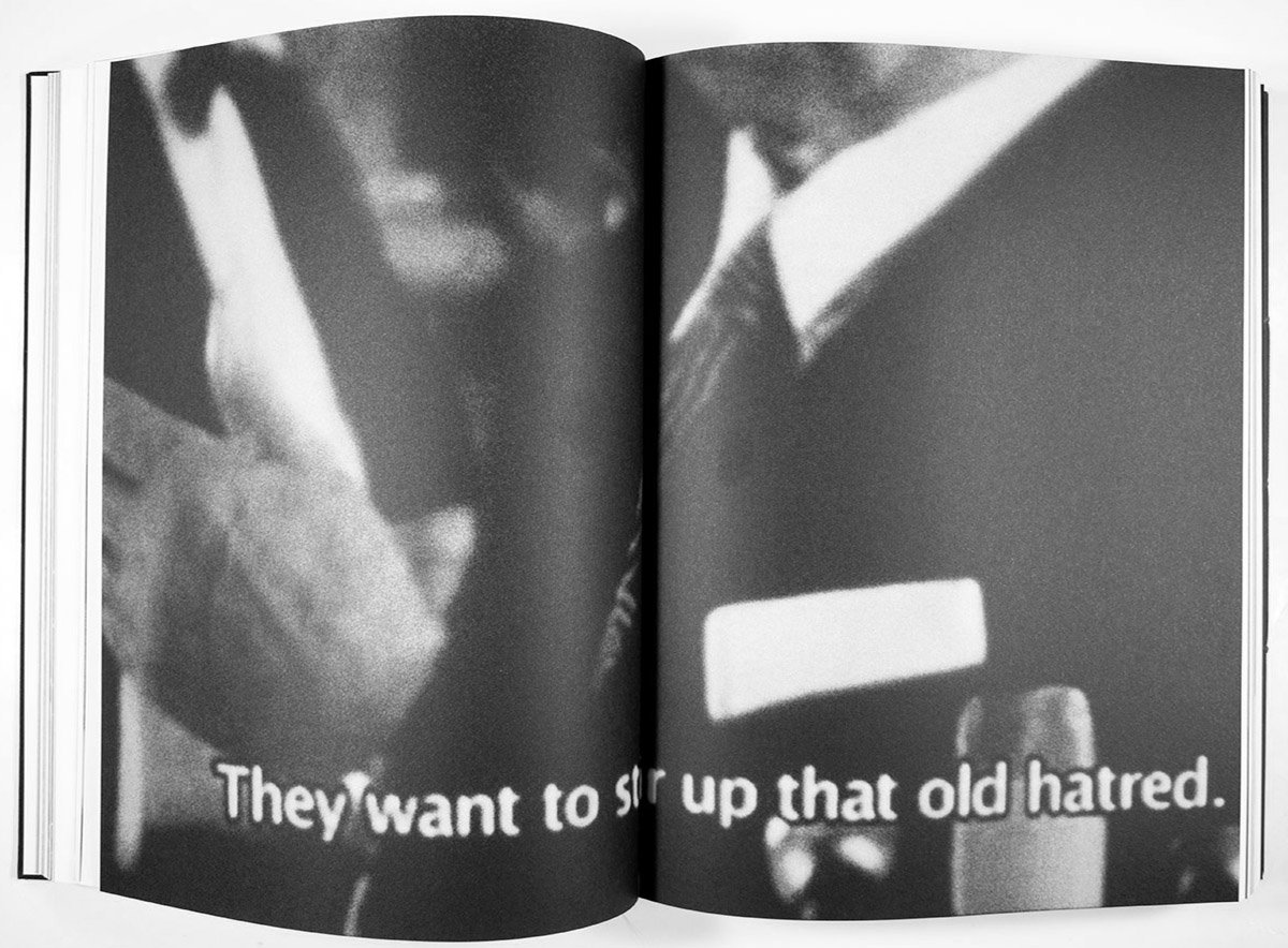 The images Kuzmanovic gives us are of television screens, crowds, deserted landscapes, individuals, graffiti, paintings and posters, billboards, roadsigns, religious figures, figures in military and police uniforms, what appear to be figures in courtrooms, buildings . . . and I could continue. Photographically beautiful and visually compelling, the significance and chronology of these images is cryptic. At no point are we given a list of specifics as to who or what we are looking at, or where, specifically, the road has taken us. The experience is an unrelenting and overwhelming flow of visual impressions. What we are given, though, interspersed throughout the images, are 29 separate text fragments, themselves functioning as road signs for the viewer to read while proceeding through this visual landscape. Taken together, these 29 lines compose a kind of prose poem, moving and eloquent, expressing the need to both search out the signs around us on this “dangerous and uncertain road” as well as stating the importance of “leav[ing] some trace behind us.” The road is unclear, but we read the signs as best we can and, in turn, leave our own for subsequent travelers.