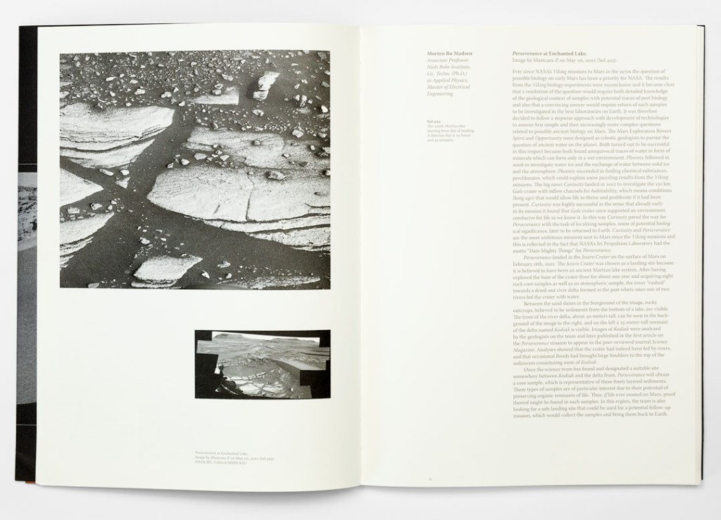 Exploring frontiers has always fired man’s imagination and inspired artistic work. Governmental organizations that explore frontiers, including NASA, the National Oceanic and Atmospheric Administration (NOAA), and the European Space Agency (ESA), reach out to artistic communities to connect their missions with the human experience. For example, NASA requires the inclusion of an Education and Public Outreach component in their programs, and the US National Science Foundation (NSF) similarly requires a Broader Impact component for proposals. These components can include artistic elements. Nicolai Howalt’s compilation and treatment of NASA’s Mars images are very much in line with this tradition. His compilation of images makes one think philosophically about the implications of space, other worlds, and the extension of man’s influence into space. The book also includes a witty poem and essay by Harald Voetmann that encourages the reader to think about celestial bodies in general, and cosmic indifference in particular.