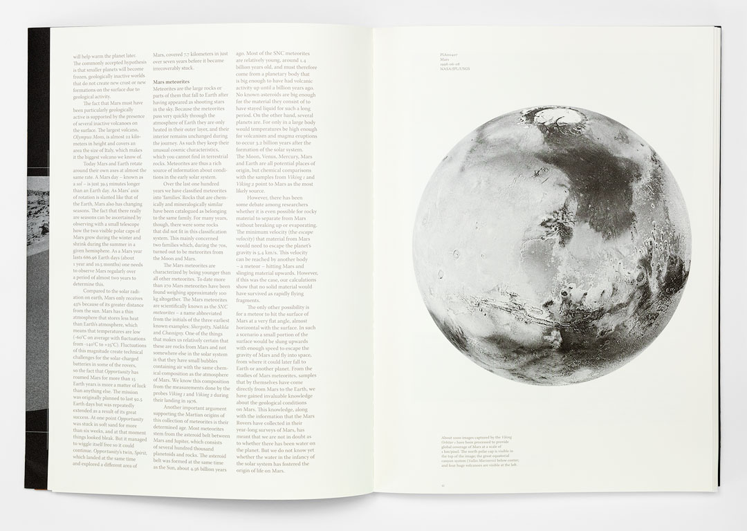 Exploring frontiers has always fired man’s imagination and inspired artistic work. Governmental organizations that explore frontiers, including NASA, the National Oceanic and Atmospheric Administration (NOAA), and the European Space Agency (ESA), reach out to artistic communities to connect their missions with the human experience. For example, NASA requires the inclusion of an Education and Public Outreach component in their programs, and the US National Science Foundation (NSF) similarly requires a Broader Impact component for proposals. These components can include artistic elements. Nicolai Howalt’s compilation and treatment of NASA’s Mars images are very much in line with this tradition. His compilation of images makes one think philosophically about the implications of space, other worlds, and the extension of man’s influence into space. The book also includes a witty poem and essay by Harald Voetmann that encourages the reader to think about celestial bodies in general, and cosmic indifference in particular.