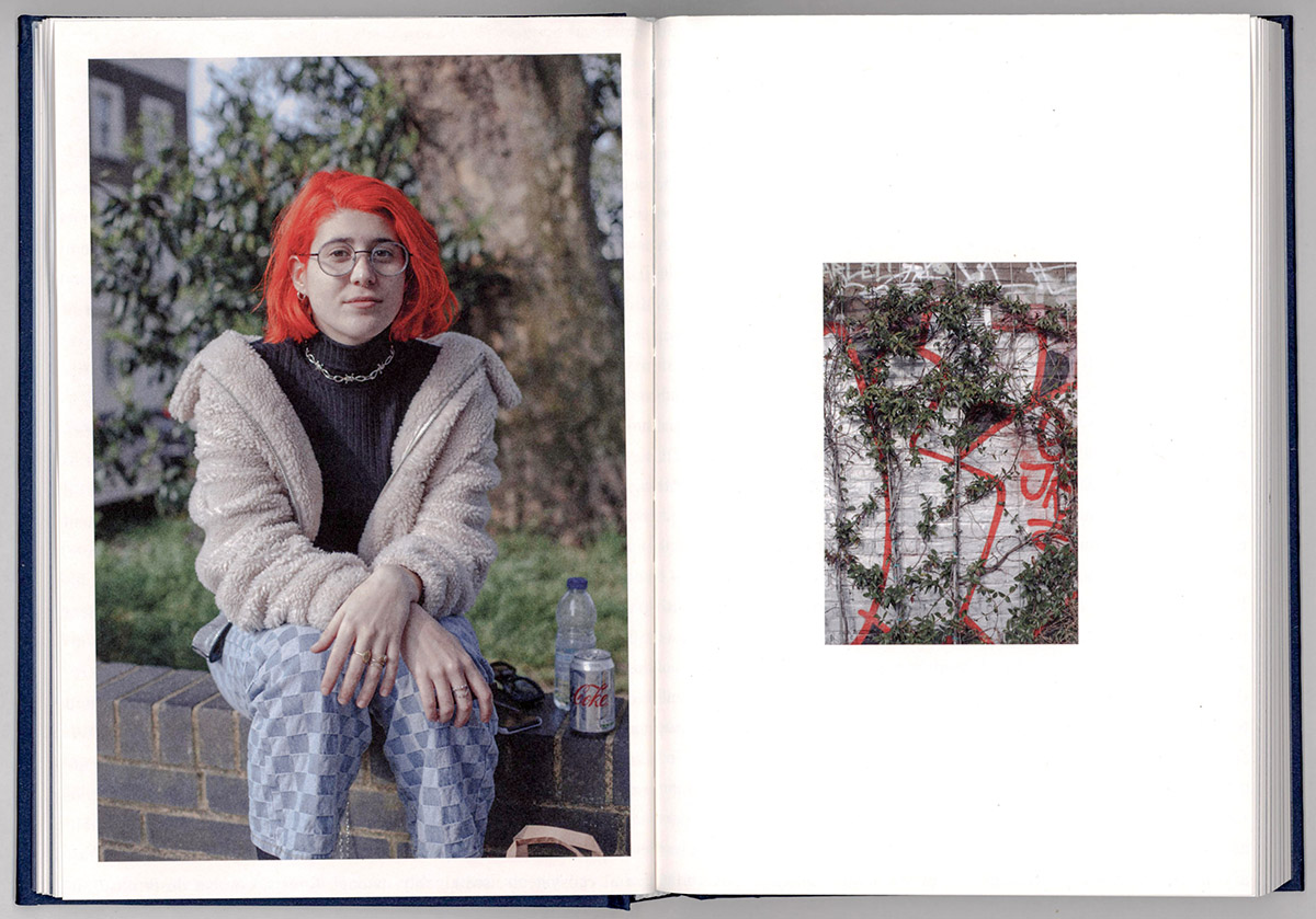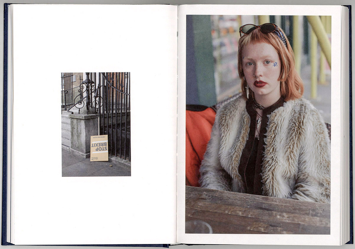 The portraits are shown as diptychs, paired in each case with smaller images of the environment, which show a variety of impulses, artifacts, and signs connected to what may affect the lives of the young women. We see graffiti, we see complex structures, and we see buildings that may represent the structured society with its many rules and regulations that will impinge on the lives of these evolving young women. Some of these environmental images are presented as full double pages to enhance the feeling of the potential impact of all of these current developments that will affect the future lives of people.