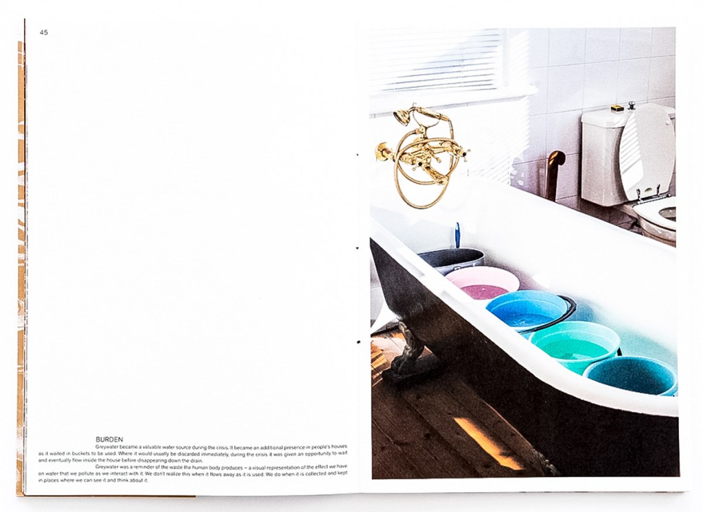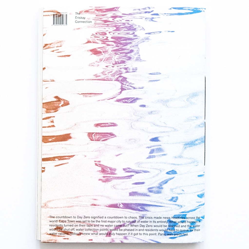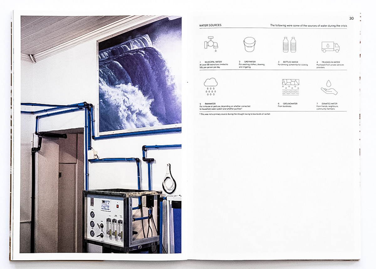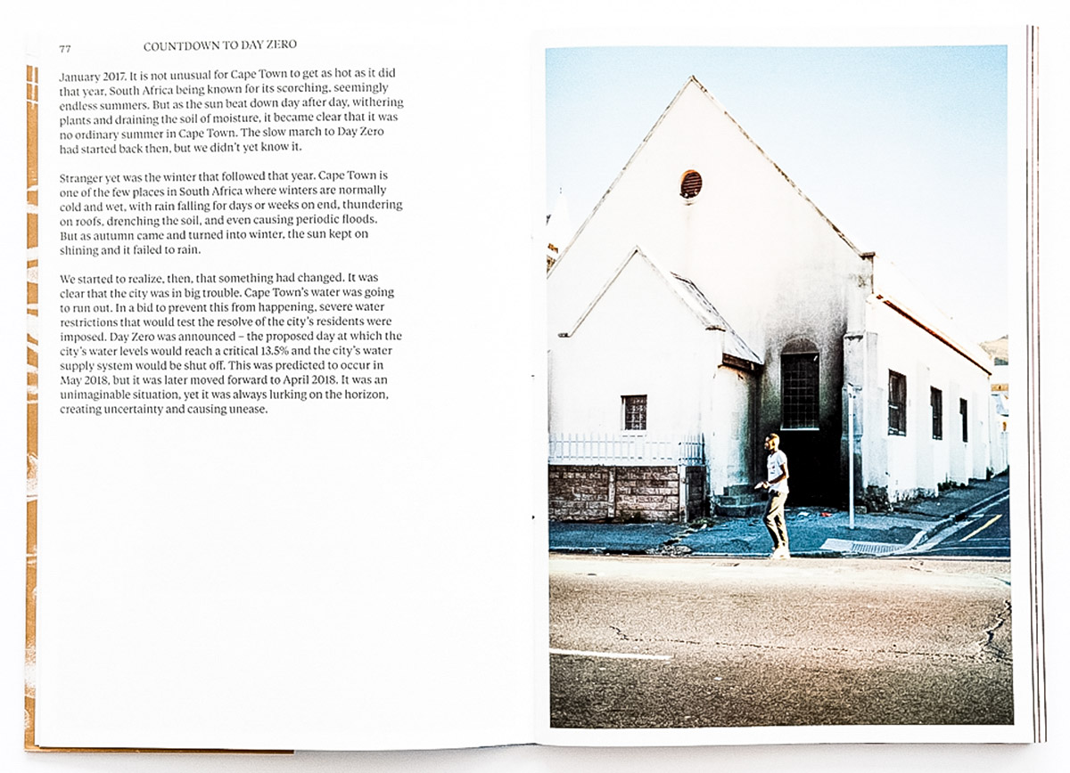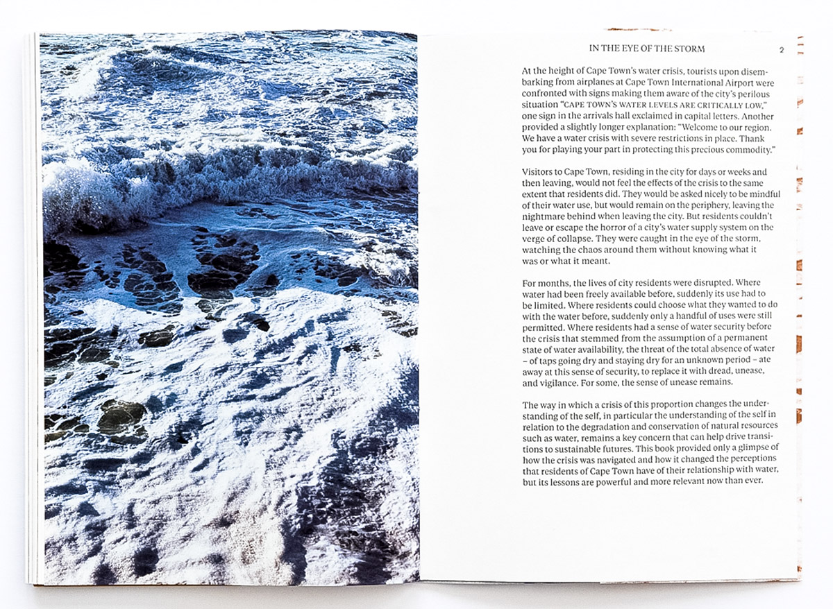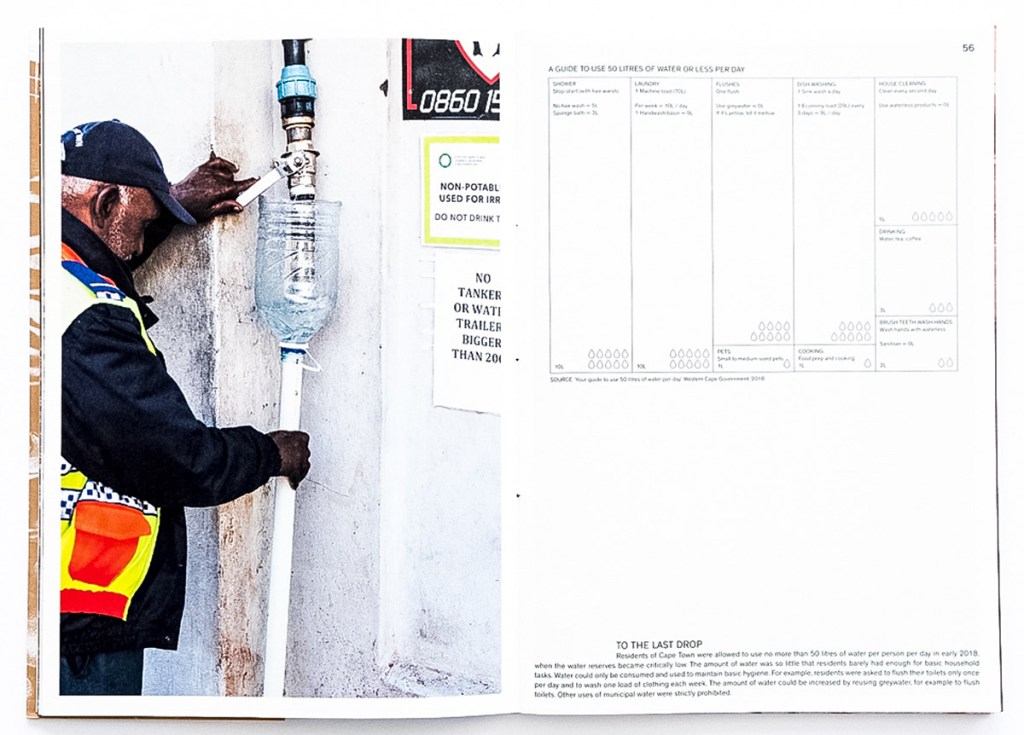 Day Zero was officially demarcated by the government as April 12, 2018, and around this time, Zwietering spent two months on-site, in Cape Town, South Africa to document what many thought would be profound consternation. However, quite sensibly, Bron is not a reportage adventure, and the book is all the better for it: in fact, analysis of the event gives credence to what Zwietering observed – that Day Zero was, in many ways, a momentous media event that had a tendency towards less engagement with material conditions of water scarcity and drought than in news-making in and of itself. Smartly, it is from this critical standpoint that Bron begins, with subtle design features to indicate the presence of the countdown (e.g., descending page numbers).
