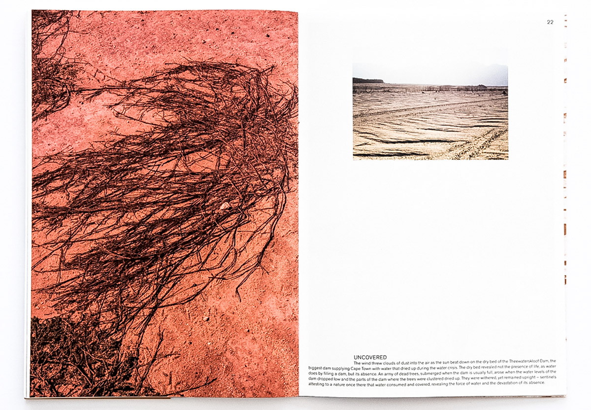 As the reader reaches the end of the book, we finally begin to grasp the meaning of Bron (source, in Dutch – is this not also a subtle recognition of the colonial dimensions of the issue?). On pages 22 and 17, the reader encounters a desiccated landscape surrounding the Theewaterskloof Dam – the biggest supplying Cape Town. Around it, we see dry tree trunks, sand, and concrete strewn about. Is it now dysfunctional(?) the reader wonders. Through the image pairings, Zwietering brings to life a scene that must have been utterly unremarkable, while also so important to the infrastructure network of the region.