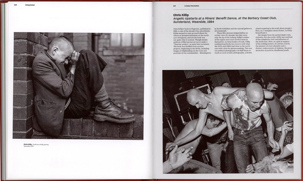 Below, I have reproduced two or three sample pages and/or spreads from each of the five sections. These take us from a time of seemingly polite compliance and relatively simple entertainment all the way to a world of in-your-face objections and presentations. We move from a world of the 1950s through the times of more rebellious 1960s, and toward later decades that paid greater attention to social issues and adjustments in society. We are also fast-forwarded to our time, in which photographers are taking greater liberties with the depiction of people; critical depictions of late have also been more accepted and appreciated, at least by some. British society and the world at large became more critical and self-reflecting in the latter part of the 20th century, and especially into the 21st, and Badger’s selections definitely reflect that fact. The selections in the color era and “digital” portion of the book also demonstrate that artistic touches to documentary photography have become more acceptable.