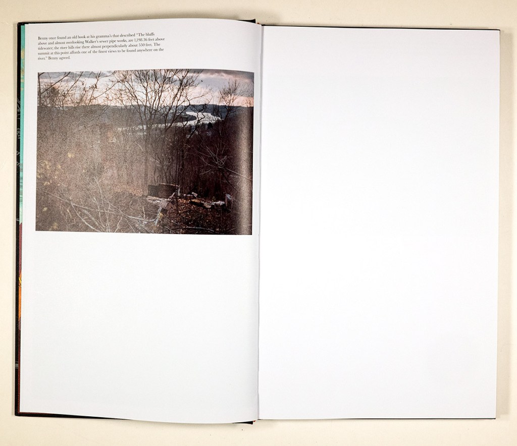 The book features 46 photographs over 88 pages. There are four fold-outs, three of them displaying plans for what appear to be industrial equipment or structures – a furnace, a plant and a mine. The fourth fold-out is a reprint of a newspaper story. Interspersed throughout are 13 fragmentary texts which feature a recurring cast of characters: Michael, Benny, Glenn, Ray, Shawn, Michael’s father, Benny’s grandpa and others. We are getting a sampling of life and events from this site in a very precise time and place (or vein or stratum) in the Holocene, our current geological epoch.
