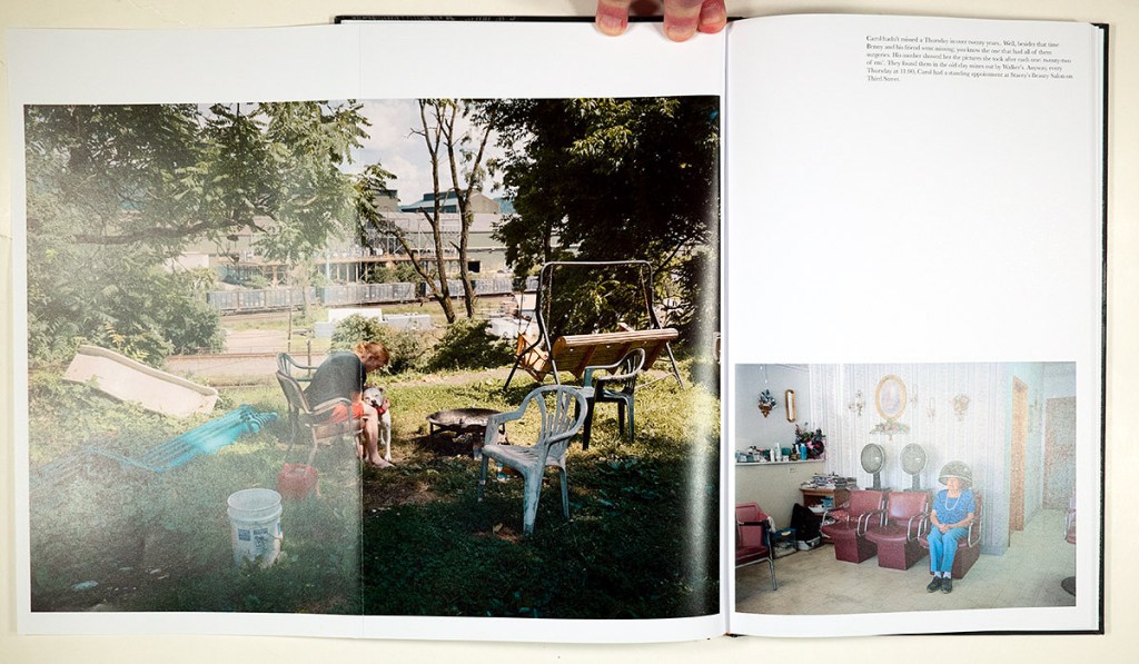 And here is where the mystery begins, for Walker’s Vein presents itself as anything but a conventional, sociological photographic documentary. Rather, we seem to be looking at these sites, these people, these events, geologically, as samples found by coring through a specific (but temporary) historical vein. Instead of a standard title page, we are given simply on the first page after the endpapers, the author’s name, which then opens onto a double-page spread of a view of a shallow river flowing under two bridges – one a railroad bridge (as we see a train crossing) and the other likely for automobiles. On a sandbar in the water a small figure sits on a bicycle. On the top right of the right page, a brief text may (or may not) be commenting ominously on the photograph: