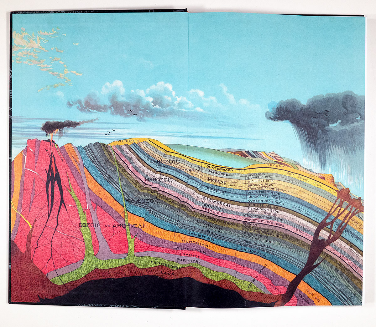 The book opens to a colorful double-page spread of endpapers featuring a diagrammatic illustration of soil layers, time periods (Cenozoic, Mesozoic, Paleozoic, etc.) and the prevalent animal life associated with each era (Bison, Mastodon, Monkeys, Turtles, First Mammals…). This reads as an archeological cross-cut laying out the history of what we assume David Bernstein has documented photographically of the area we now know as Ohio. Bernstein offers up contemporary samples of the top layer or vein – the current lives of people and events presented visually and in short, narrative fragments.