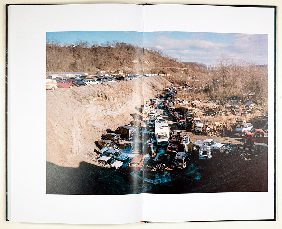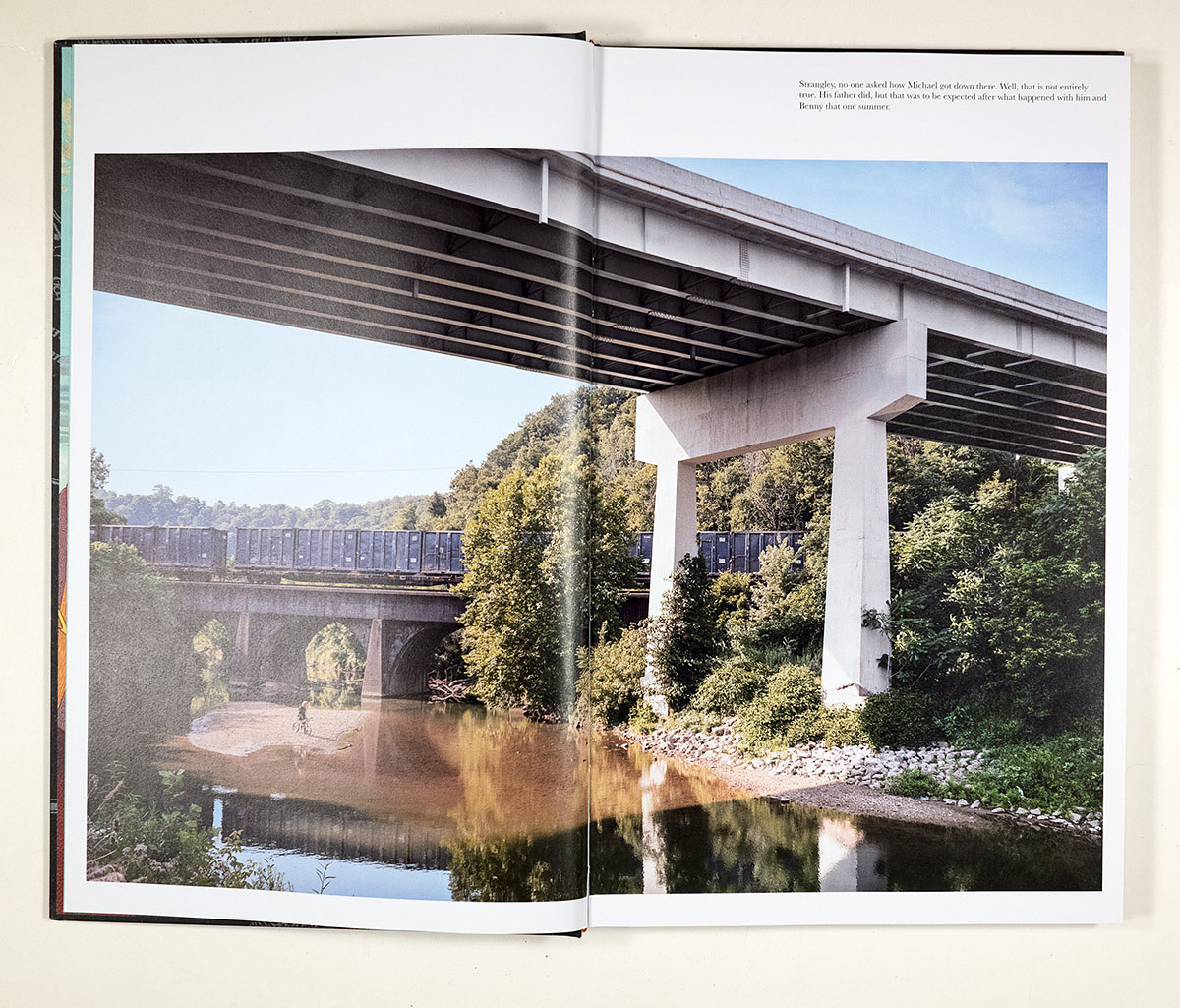And here is where the mystery begins, for Walker’s Vein presents itself as anything but a conventional, sociological photographic documentary. Rather, we seem to be looking at these sites, these people, these events, geologically, as samples found by coring through a specific (but temporary) historical vein. Instead of a standard title page, we are given simply on the first page after the endpapers, the author’s name, which then opens onto a double-page spread of a view of a shallow river flowing under two bridges – one a railroad bridge (as we see a train crossing) and the other likely for automobiles. On a sandbar in the water a small figure sits on a bicycle. On the top right of the right page, a brief text may (or may not) be commenting ominously on the photograph: