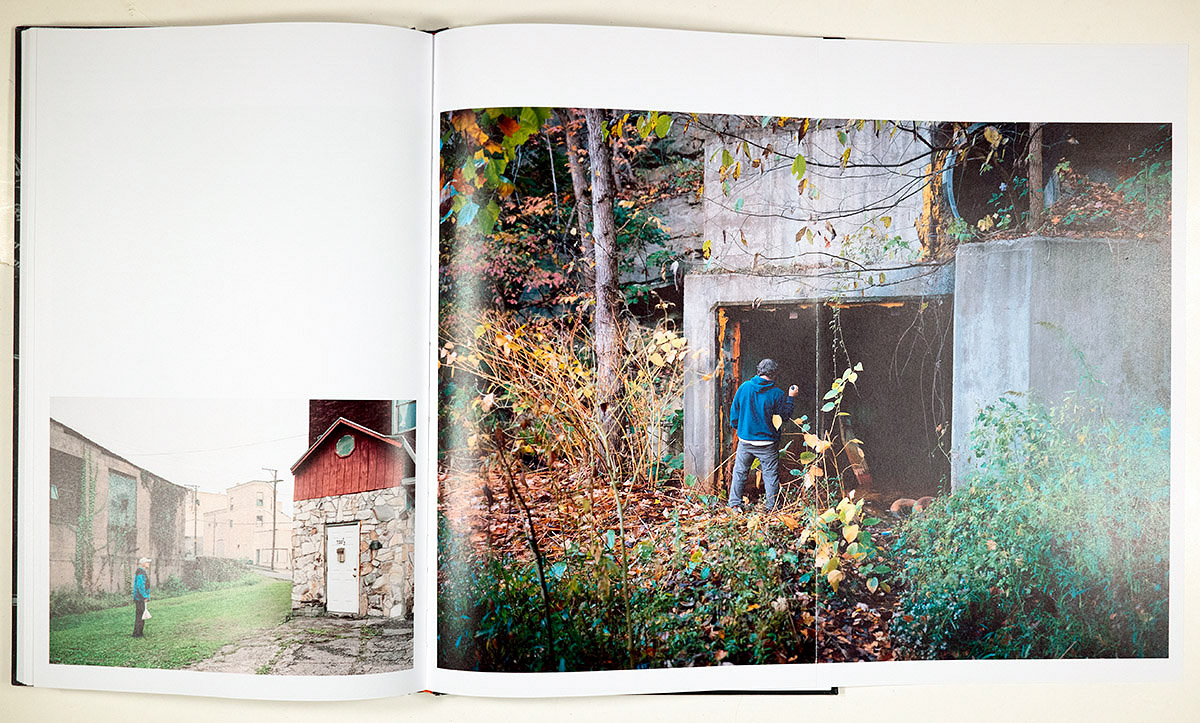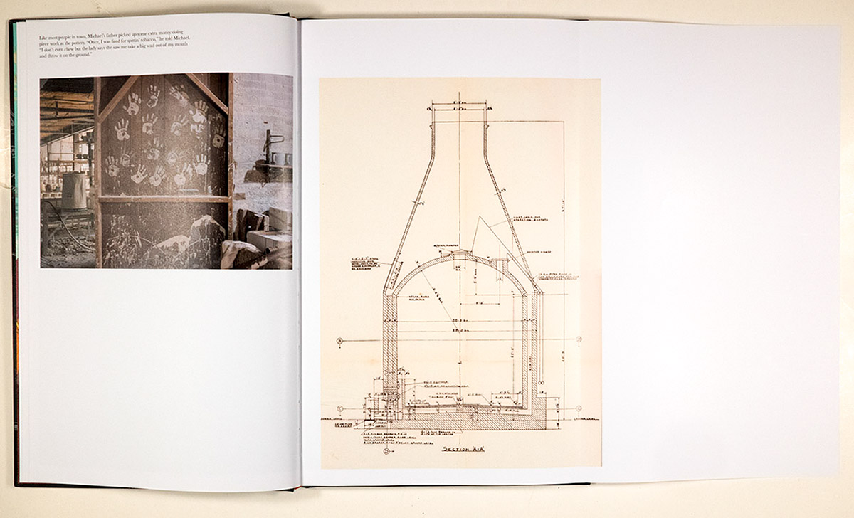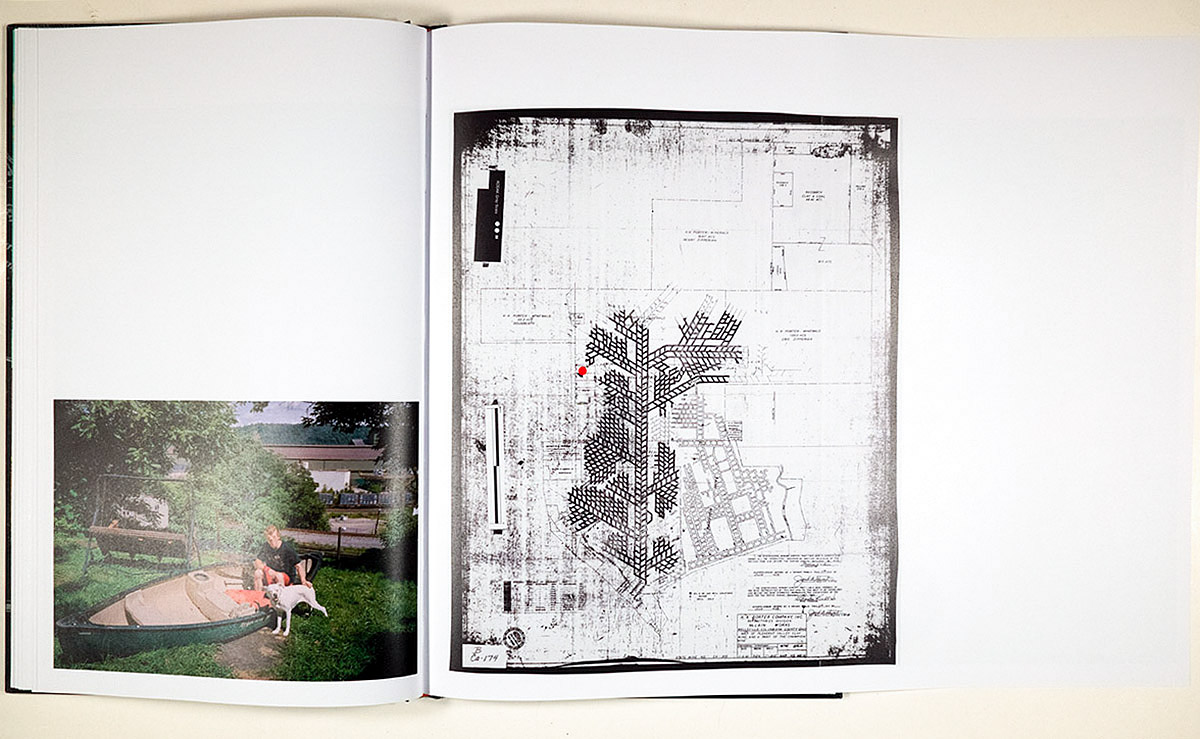 The book features 46 photographs over 88 pages. There are four fold-outs, three of them displaying plans for what appear to be industrial equipment or structures – a furnace, a plant and a mine. The fourth fold-out is a reprint of a newspaper story. Interspersed throughout are 13 fragmentary texts which feature a recurring cast of characters: Michael, Benny, Glenn, Ray, Shawn, Michael’s father, Benny’s grandpa and others. We are getting a sampling of life and events from this site in a very precise time and place (or vein or stratum) in the Holocene, our current geological epoch.