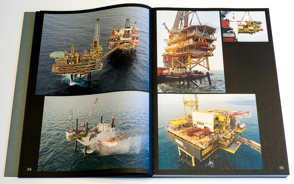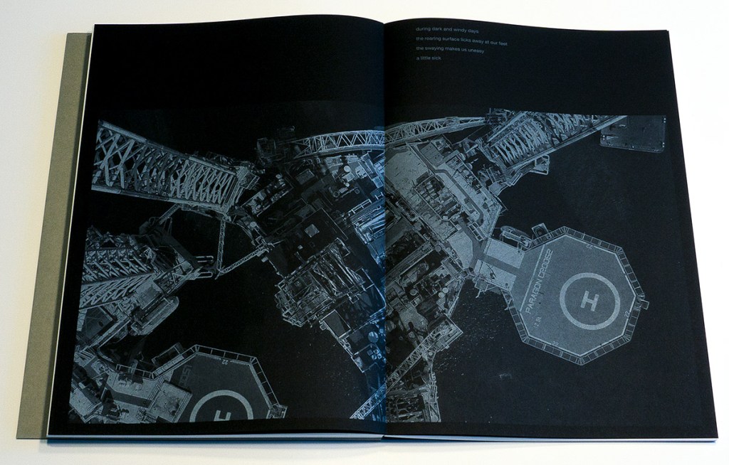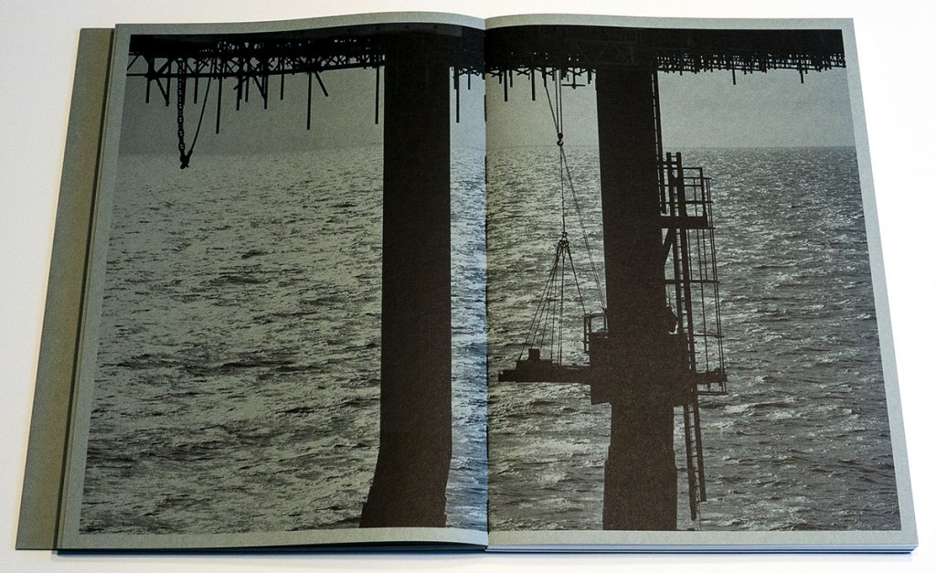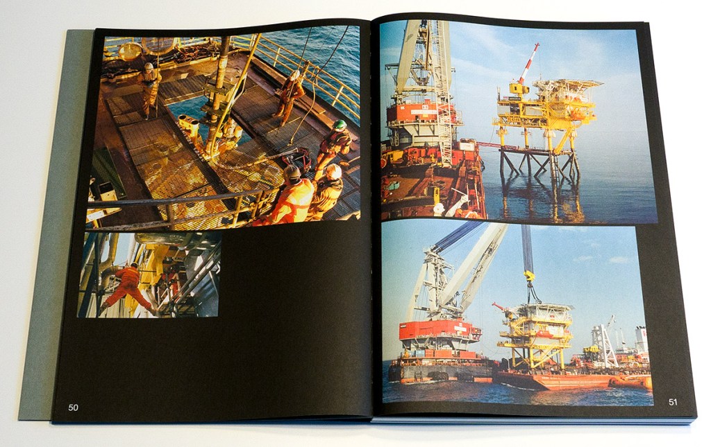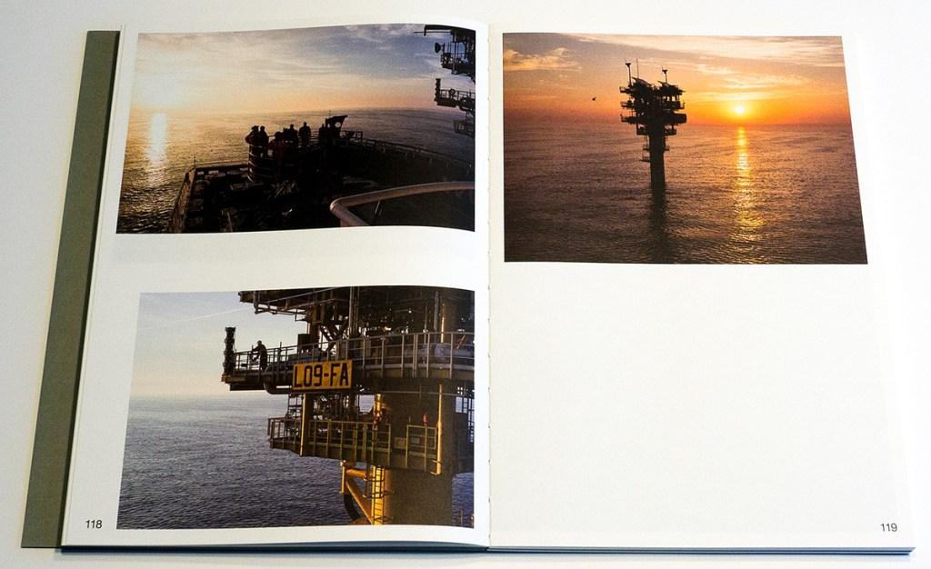 On my first pass through Forgotten Seas, I was drawn to the physical architecture so expertly captured. When viewing oil rigs of varying sizes, arrangements, and states of repair, I was struck by two feelings. The first — and perhaps from where the photobook draws its title — was a sense of foreignness. Regardless of my feelings about continued dependence on fossil fuels, there is something interesting, frustrating even, about the fact that these ugly and beautifully intricate marvels of engineering are so unfamiliar, forgotten. Much of the world I inhabit is powered by oil and natural gas siphoned from below the ocean floor, but I am never confronted by them, nor directly impacted by the environmental burdens they impose (climate change being the exception). I was secondly struck by a feeling of loneliness. I have no idea what it is like to live and work on an offshore oil rig. Yet, when I look at photographs of small, solitary metal structures dropped into the vast North Sea, how am I to imagine it as anything but isolating? What must it be like to spend weeks on end, knowing that you are a part of a network of rigs, but that this network is spread across untold distances, connected only by giant ocean liners, helicopters, and endless waters?