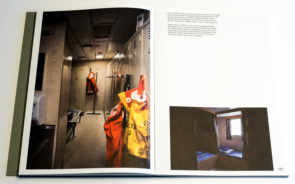 And it is here that Engelberts’ theme of “forgotten” took on a deeper meaning for me. There is a human component to these structures that is hard to place. To provide comment on offshore energy production is to comment on offshore labor. Rigs are not only giant steel beams. They are people performing tasks, even if forgotten or actively rendered invisible. Throughout the book, Engelberts provides her own photographs, as well as archival photographs, of men clad in safety orange and hard hats, working diligently to assemble, erect, maintain, and even disassemble offshore rigs. Yet, the photos and author notes that I felt most moved by were those in which human presence was implied, but not shown: a locker room with orange jackets hanging, an empty dining room, helicopter pads kept clear and empty, entire rigs seemingly vacant.