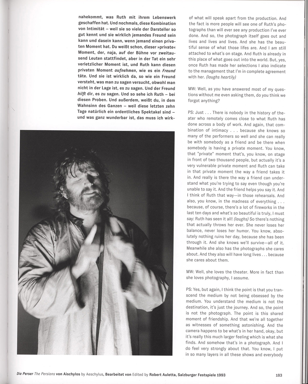 So it was wonderful when I was in Salzburg, Austria, this summer and saw the exhibit of the work of Ruth Walz at the Museum der Moderne (Rupertinum), which will still run through November 12, 2023. Appreciating the work firsthand on museum walls served as an excellent reminder regarding this elaborate photo book that was published by Hatje Cantz at the end of 2021. It features Ruth Walz’s work in great detail, along with many excellent explanations. The accomplishments of a photographic career of documenting and interpreting stage work cannot be summarized easily in a short review like this, especially since 50 years are involved, half a century of collaboration with creative teams on various stages, but the book goes a long way toward providing a comprehensive approach.