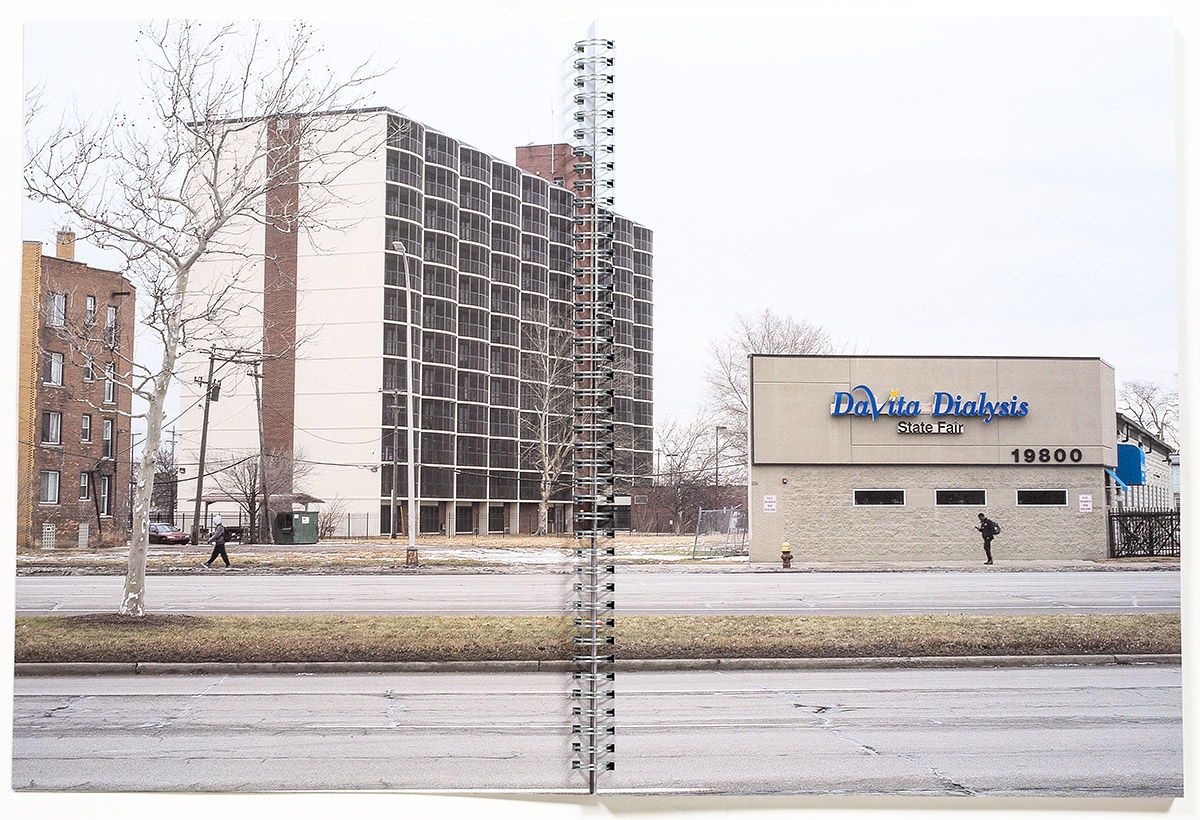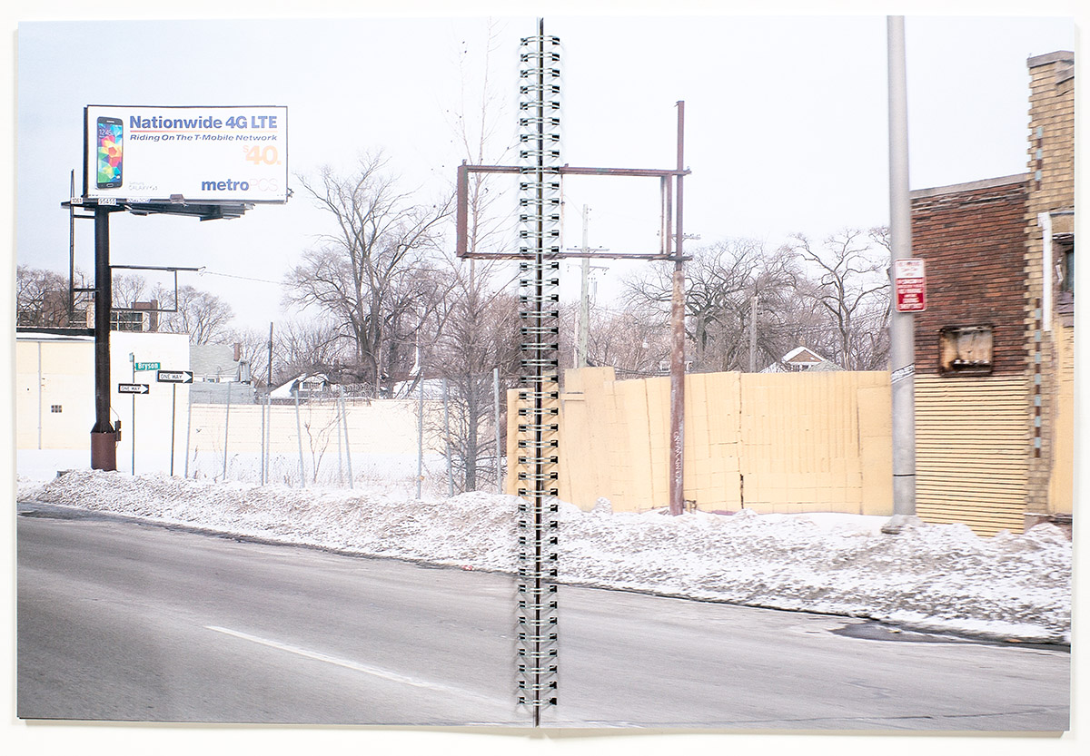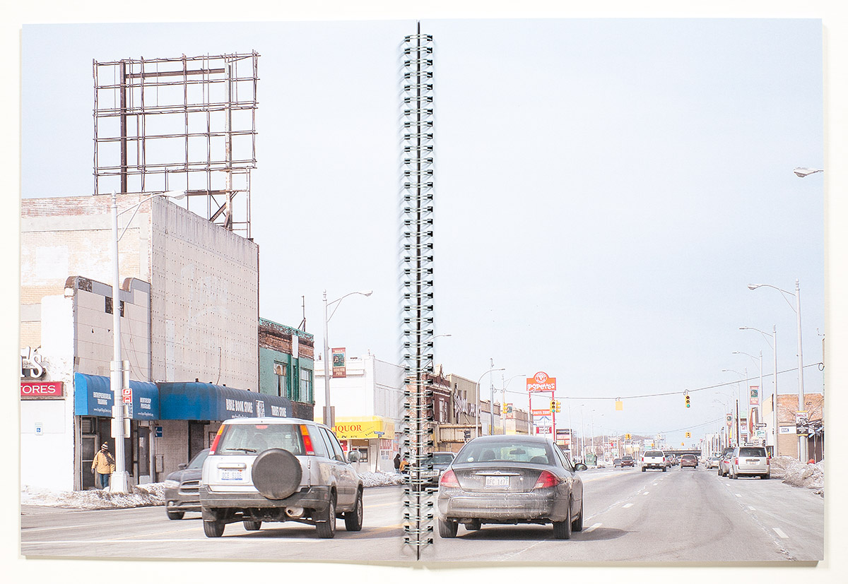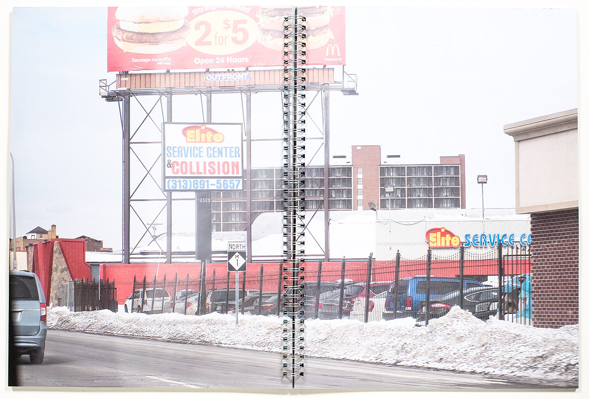 There is no supporting text for this volume to provide any context. On his website for this project, Kasners does provide the following “The pictures taken as a pedestrian cover some of the distance that later was traversed by car. Thus, contrasting two speeds of movement, pertaining to different kinds of mobility and differing levels of peoples’ access to the city.” There are two different perspectives provided, one on foot while the other from a car. Nevertheless, there is one aspect of Detroit that appears to be overlooked, as a car-centric urban center, it sees everyone has access to a car, abet in various conditions and states depending on their economic statis.