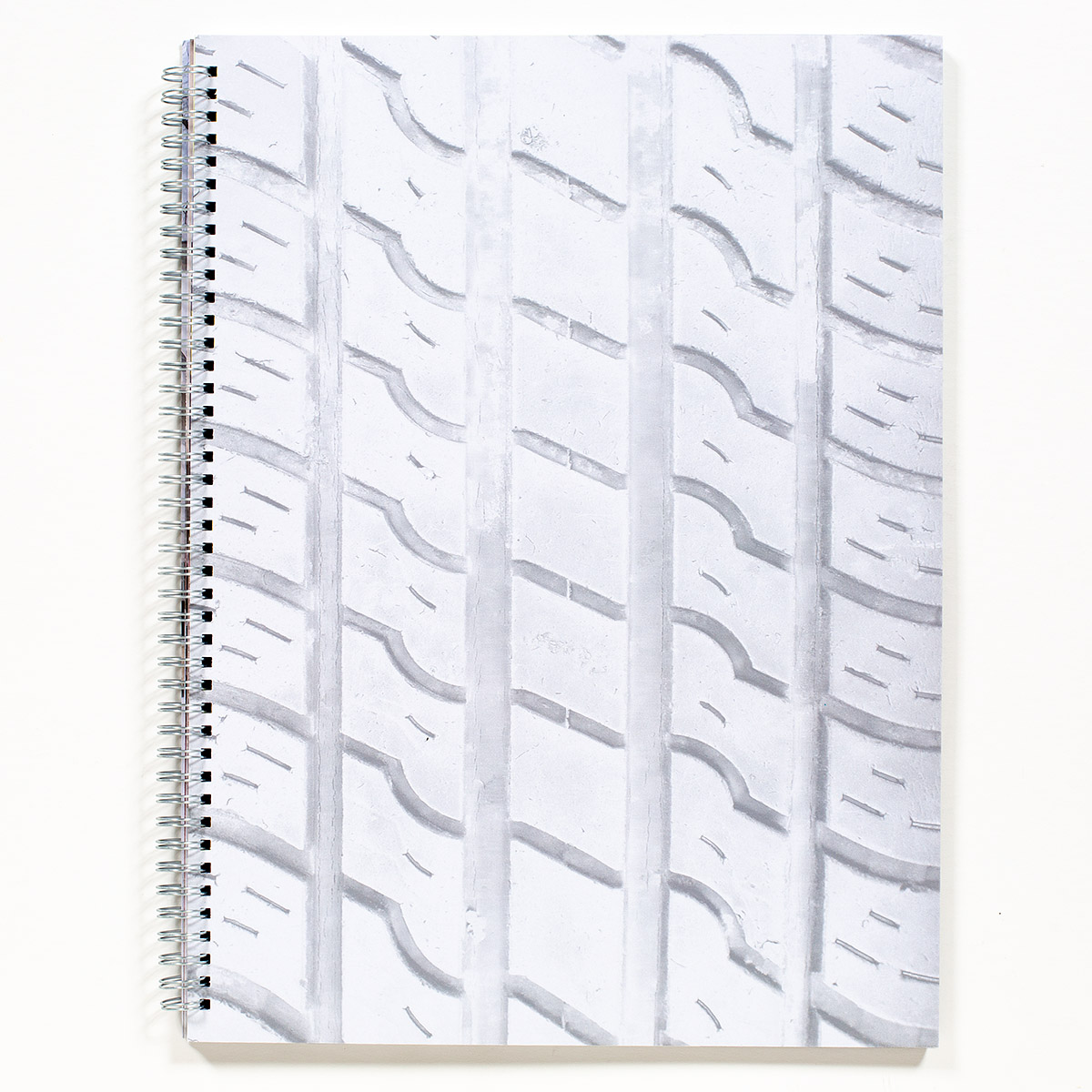 The spiral bound binding allows a lay flat read for this large book that provides a massive 14-1/2” high by 22” wide photograph for each of the double-page full bleed images. The visual effect is stunning. The shiny wire binding running up the middle of the two-page spreads provides a subtle hint of the cover’s tire patterning as well as providing a common utility appearance, which reflects the underlying theme of this photobook. The overall design of this photobook is another great example of how a book’s layout and production elements can complement and support a photographic narrative.