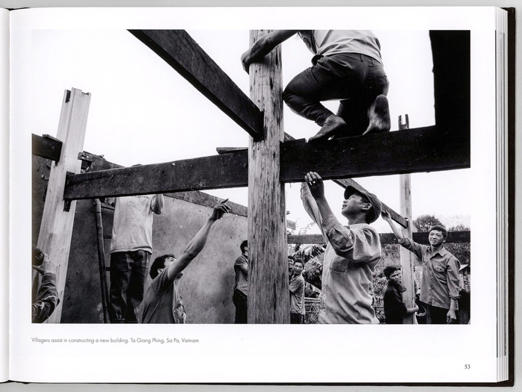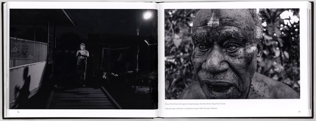 Starting with the cover picture, we see superb observations of personal factors. The farmer is aware of the personality of his chicken and provides a personal serenade, perhaps to create a calmer moment. Some of the other pictures show struggles of various kinds, whether it is in the construction of houses, or in the raising of crops, or in attempting to continue various everyday rituals, preferences, and customs. The changes exacted on society, especially the rural population, by the forces of nature and of commercialism are substantial. While one person tries to find connectivity for his cell phone for his contemporary form of communication, on the opposite page the blind chief of a tribe sings a different form of communication, a song in a language soon to disappear.