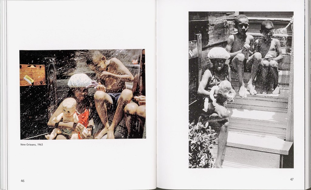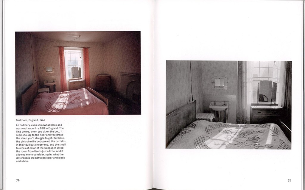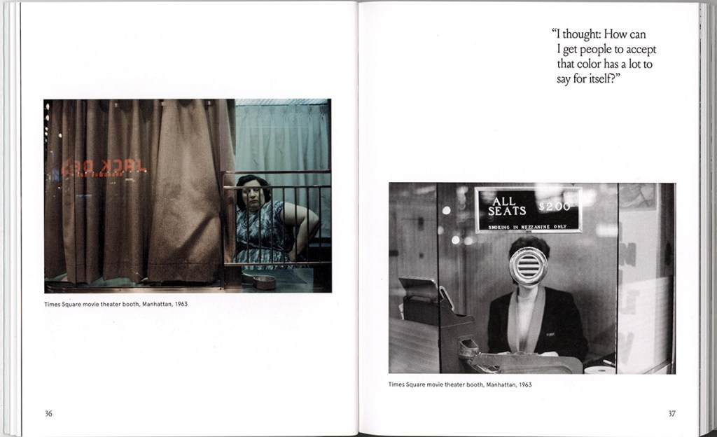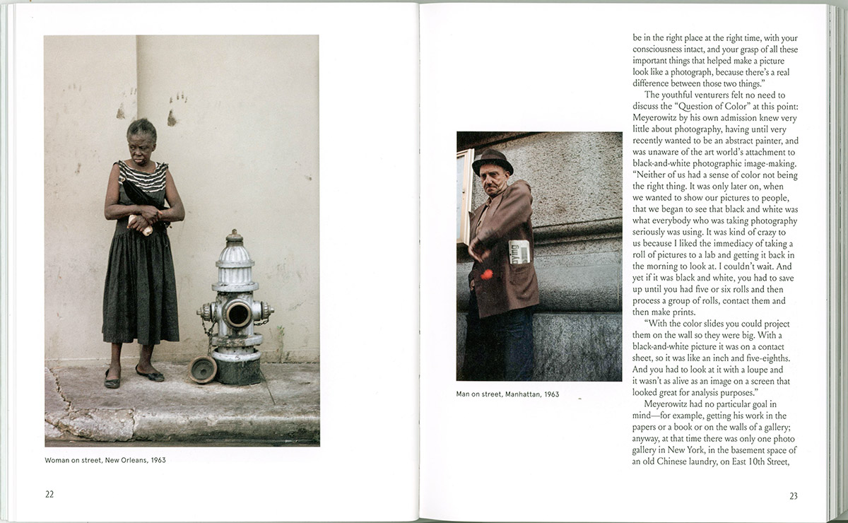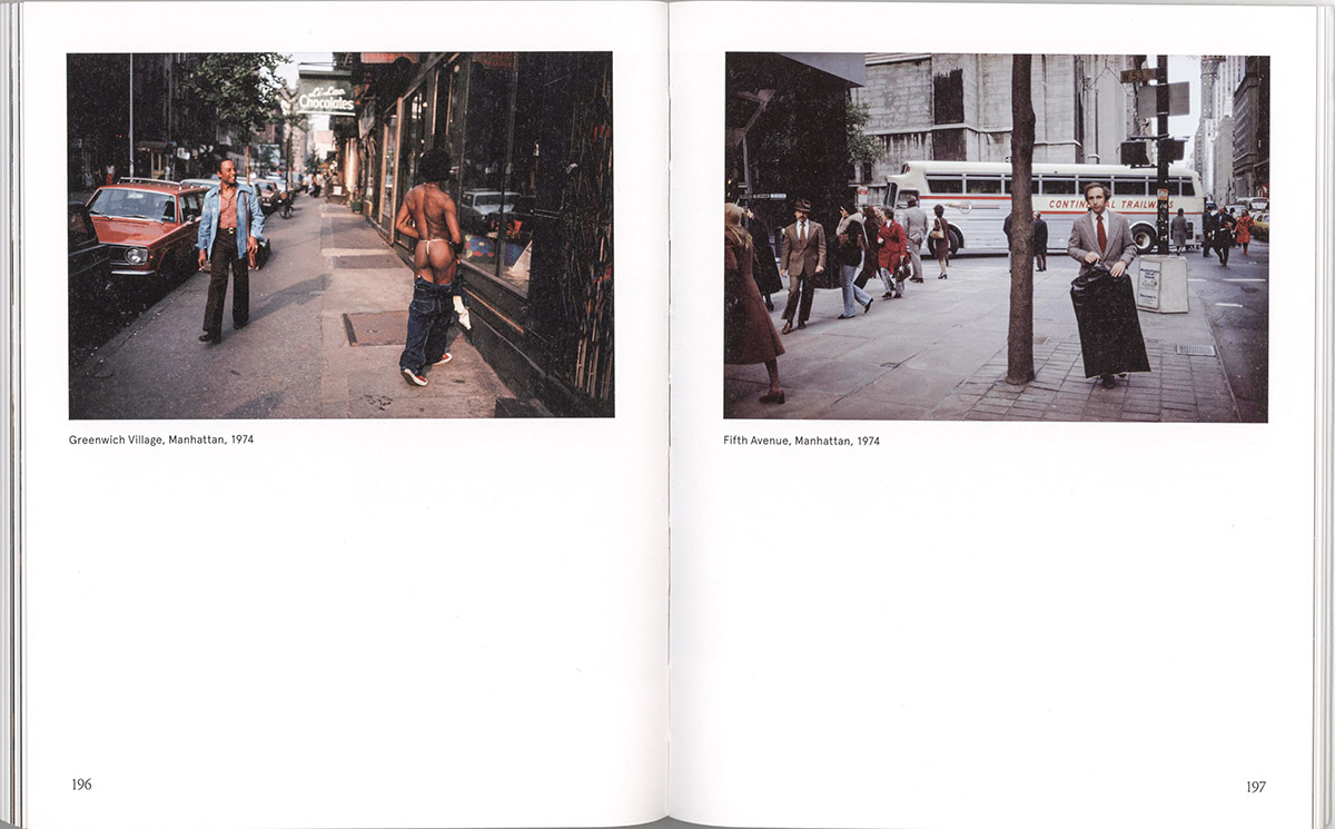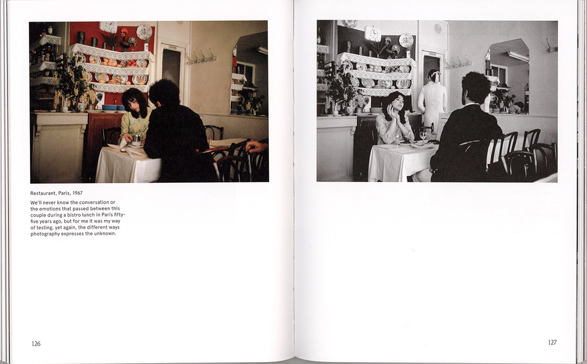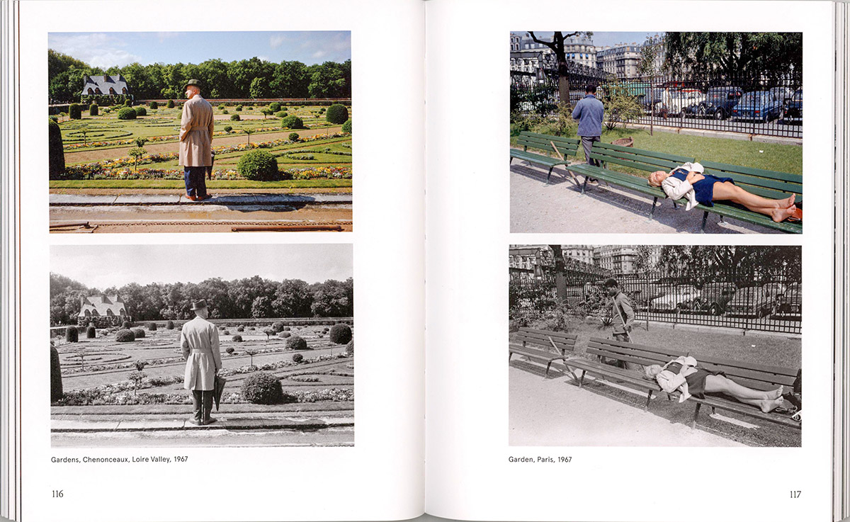 The book is divided into five parts: “Early color,” “First pairs,” “On the road in Europe,” Return to America,” and “Letting go and moving on.” Below, I am showing nine double pages from the book which illustrate some specific points. The book takes us from the photographer’s first discovery of color as a more vibrant and immediately accessible artistic vehicle (large projected slides versus small images on contact sheets) to a time in which color photographs were accepted as a less historical, more reality-oriented, and less abstract way of representing the world.