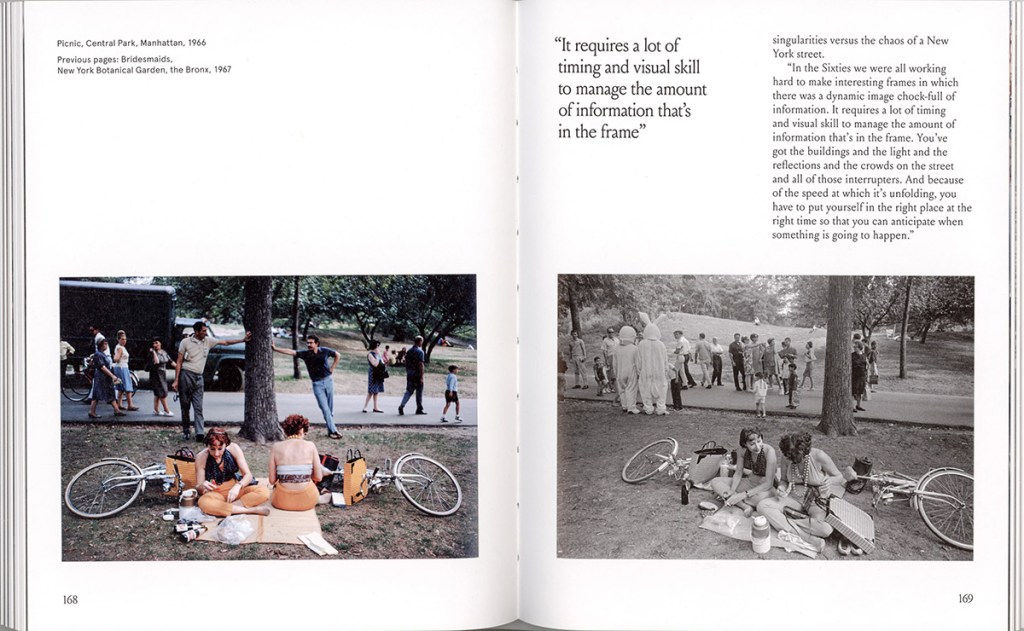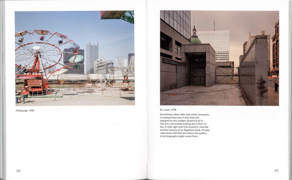The Central Park photographs also illustrate the meticulous attention that Meyerowitz paid to composition of a complex scene within a particular frame. The judicious use of color in the two New York City photographs contrasts two distinct moments in two distinctly different parts of town. We also can study many images where he uses color to transmit a certain mood, such as the liveliness of an entertainment area versus the gloominess of an industrial section of town. The layout and design of the book are quite pleasant and varied, so there is much encouragement to discover many things.