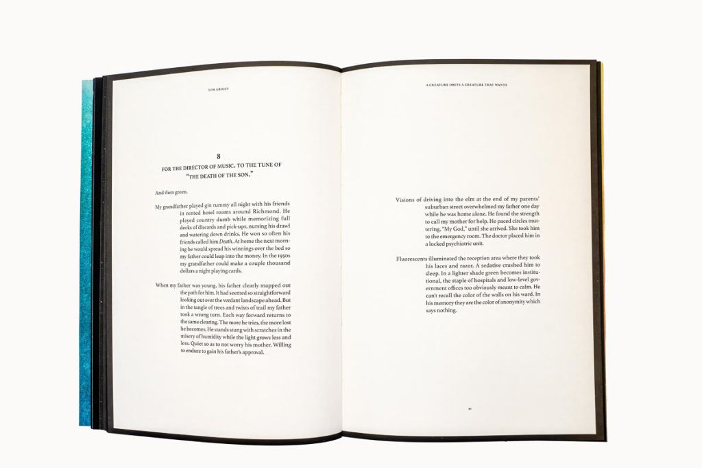 About the halfway point into the book, Griggs introduces text. The paragraphs are very separate from one another and they all begin with a hanging indent. This design quickly brings your eye into the body of the short paragraph, each one a deeper dive into the father-son relationship and growing mental illness of the Dad. Each page turn uncovers more of the journey; the abstract images become more literal, more connected with the story.