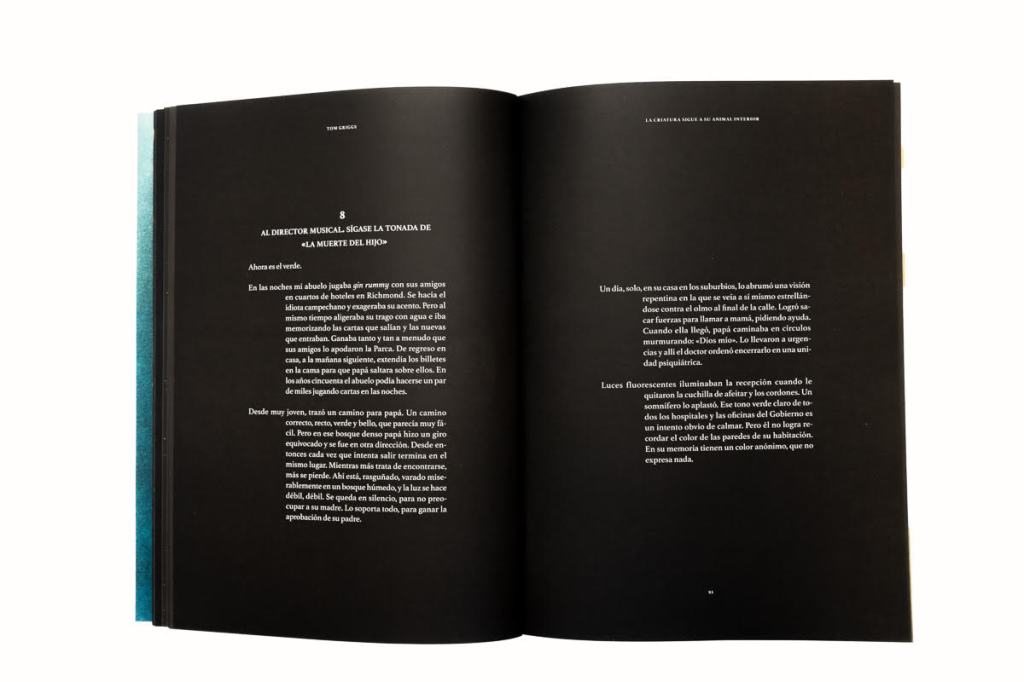 Most of the text in the book is translated to Spanish on the page immediately following the English. The English pages are black typeface with an ivory, tan background; Spanish pages are white typeface with a black background, a dramatic switch from one language to another. I was appreciative of the Spanish translation. Oftentimes another language provides additional texture with a slightly different perspective or view. The translation was outstanding and added to the rich emotional experience (although not reading the Spanish version does not detract from the experience). For instance, in Chapter 9, first line, the English, “Gray winks out as well.” In Spanish on the following spread, “El gris se extingue.” or the gray extinguishes itself, the same but with a slightly different, perhaps richer, feel.