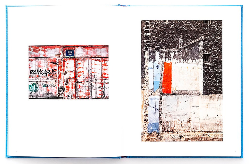 Reading the book is a visual pleasure, but it is not cliché. You might see bridges, boulevards, and beaux batîments, but only through the singular vision of Fontana. The sequencing of the book is largely organized by color and form. This does not occur in so much of an obvious thematic order, but Fontana prioritizes the interaction of facing pages. The decaying red and white façade of the Rue Piat plays off the vertical red piece of building material amidst a façade of blue, white, and gray. In a later sequence, telephoto shots of the visible density, even business of Paris are juxtaposed together – on the left the blue-gray rooftops accented with the terracotta pipes and shingles, and on the right we see an older image of Montmartre’s Pigalle district with a distant Moulin Rouge. Even here though, while nearly every tourist, including myself, takes an image of the famous red windmill, here Fontana subverts expectations and constructs a striking image of Paris.