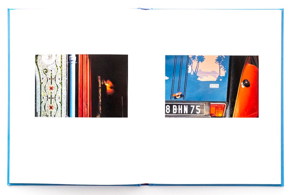The use of color is, perhaps evidently, central, in this unique “street photography.” Quite literally, we are getting things on the street, as the details of the back end of a colorful blue and red Citroen car play off a blue and red paint job on a hotel. Color meets form in a number of striking image-pairings as well, where Fontana uses the telephoto lens in surprising ways. However, and quite importantly, as clearly Fontana’s concern is color and form in the Parisian landscape, Fontana’s method of using the telephoto lens is not at all like other contemporaries such as Beat Strueli (known for his 200mm street portraits). Instead, Fontana, in a way, takes a step back, and uses the telephoto lens to abstract the conjunction of the built environment with human activity, emphasizing the busy conviviality of the city, whether with abstractions of Parisian buses or gatherings outside shopping malls or other buildings. At the same time, another incredible virtue of this book is that the viewer/reader can never pin down Fontana. With each spread, one doesn’t know what to expect. He uses the telephoto lens in one sequence, then a wide, perhaps 28mm lens in the next. Similarly though, his concern with visual juxtaposition and a combination of complex line structure, color, and even texture provide a unique visual take on Paris, and one that is certainly quote beyond the typical books you may know of Paris (couples kissing, bridges, etc.).