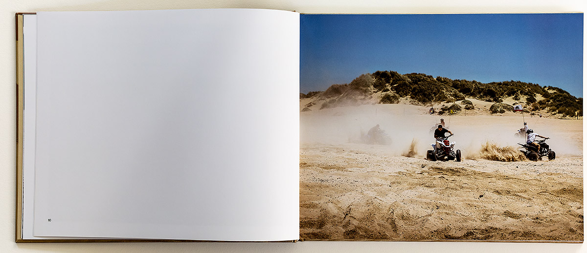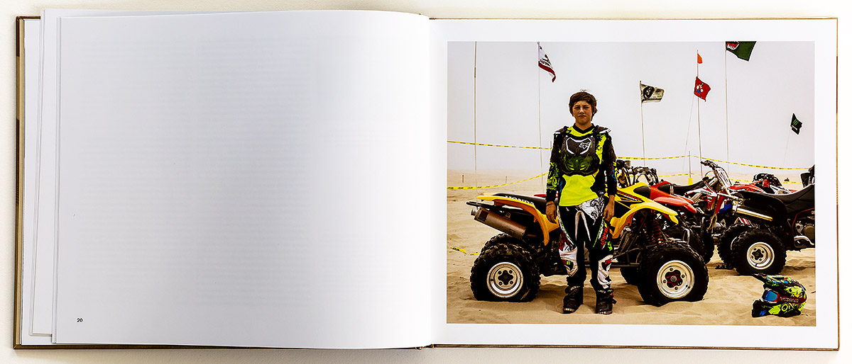 Caplan intertwines her narrative with beautiful classic ‘Weston-istic’ black and white landscapes of beautiful pristine dunes, a testimonial to the future, when over time, nature and the sand will overcome everything and all traces of mankind will be erased. Similar to how the expansive 1920’s movie set for the DeMille classic Ten Commandments has mostly disappeared under the unrelenting wind-blown sands. The dune landscapes are provided as juxtaposition of positive and negative versions, reminding me of Wynn Bullock’s negative prints, who was a later contemporary of Weston’s West Coast Landscape genre. The inclusion of these classic landscape photographs in Caplan’s sequencing provides metaphorically jarring contrast to the portraits of the ATV community.
