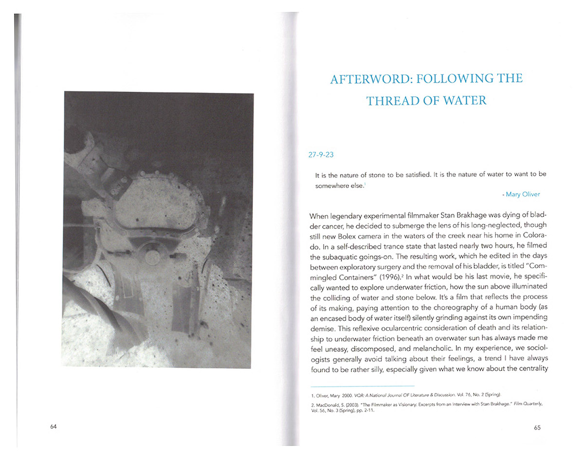 The book has five chapters and a significant afterword by Greg Scott. Each short textual chapter concludes with abstract underwater images adding context and perspective reality to the text body. “Reflexive wandering…” is how the book’s back cover describes its content. To me, the arc of the story and supporting images was purposeful and productive. The text is a blend of prose, poetry, field notes, conclusions, graphics, and references.