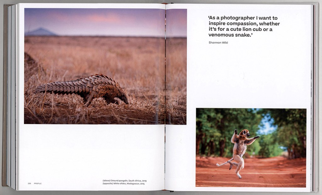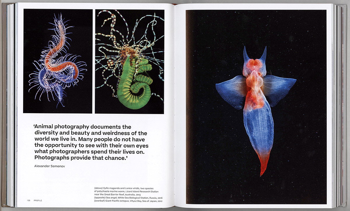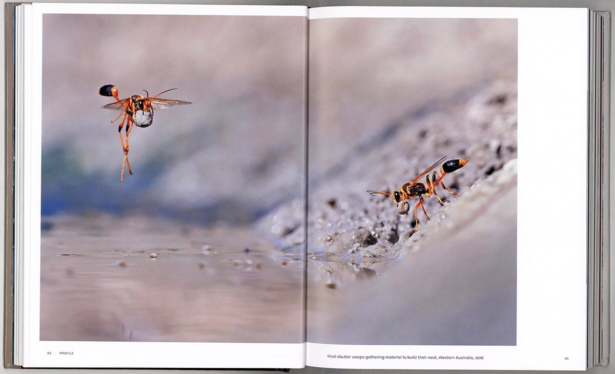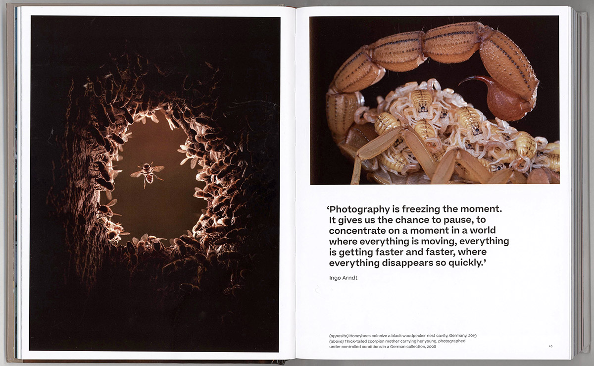 The images accompanying background information are presented as grouped overviews for the most part, as can be seen in the historical picture collage shown below. The contemporary photographers’ work is mostly printed as double-page spreads. Both unusual images of well-known animals as well as very interesting close-ups and macro shots of more elusive, lesser-known creatures are beautifully presented. I am showing a small range of representative photographs below; there are several hundred more in the book.