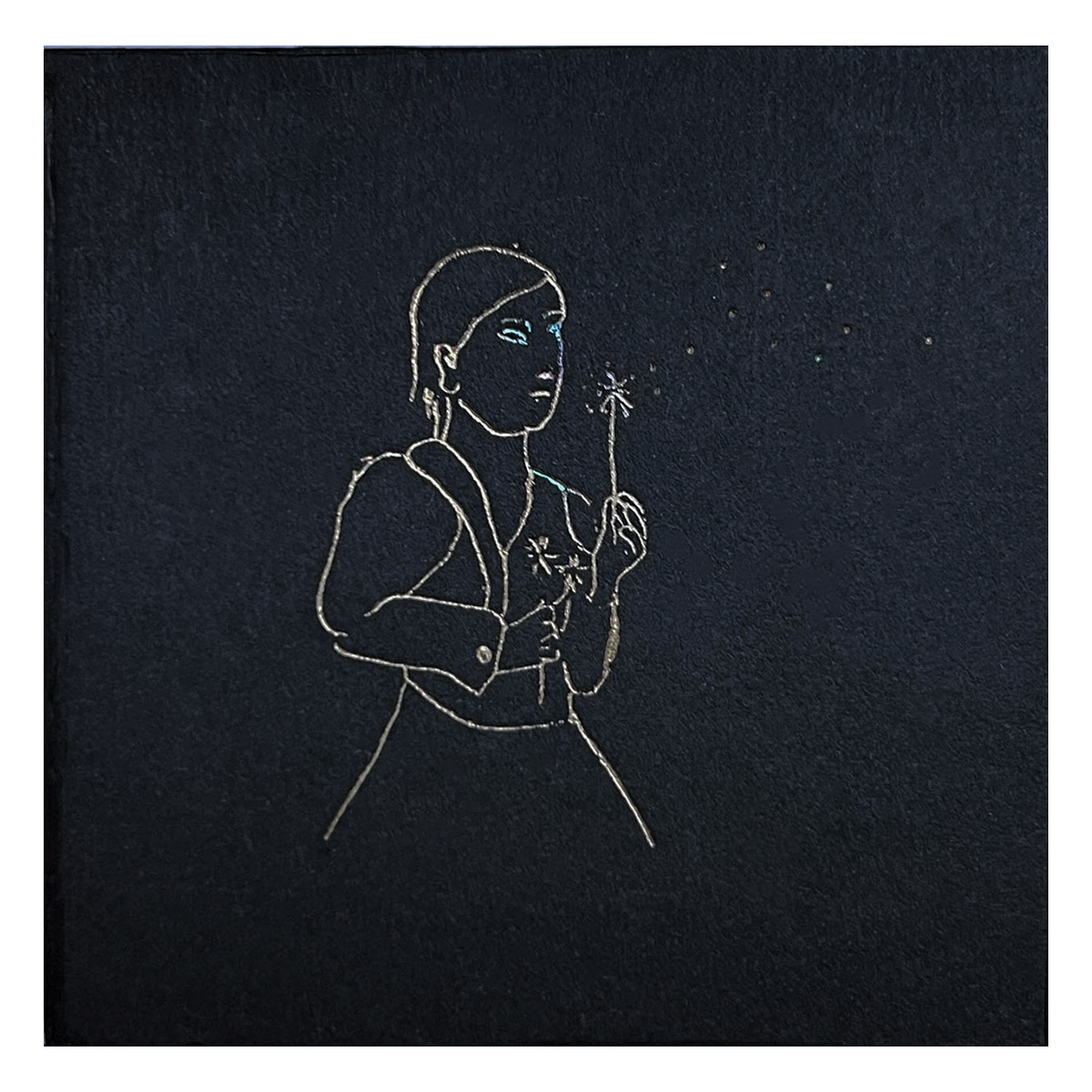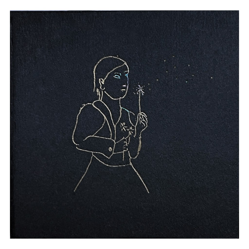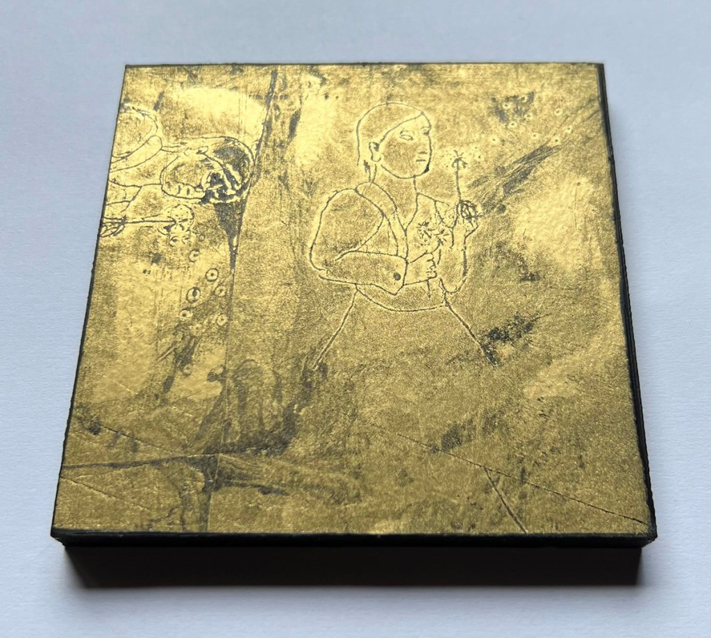 The front cover is black and shows a child that looks scratched into a surface, like an etching, with faint gold coloring and a few tones of blue as well. When we are done with the little book, we look at the back cover and are shown what looks like a goldleaf surface that changes its sheen, depending on how you hold it toward the toward the light (last image below). Does this give us some assurance, some feeling of optimism that things might turn positive? It too is a somewhat tentative presentation.