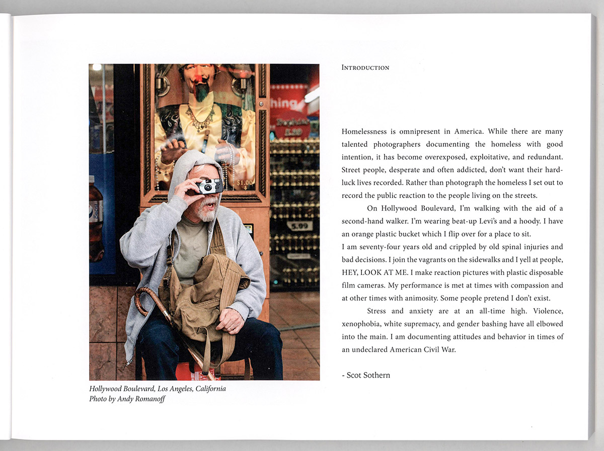 Scot Sothern is a very innovative photographer. For this project he decided to mingle with the Hollywood Boulevard people, assuming the guise and behavior of a street person. As people passed by, he yelled “Hey, look at me!” and snapped their pictures with a disposable film camera with flash. A kind of study of people’s reactions to those living on the street was the result. Not only that, he lived to tell about it in his inimitable prose, as well as to present us with a book that manages to bridge the normal distance that street photographers usually have created between themselves and the subjects they depict, often conditioned by their demeanor and/or their appearance. In image 1 below, you can see Scot Sothern as he appeared on the street.