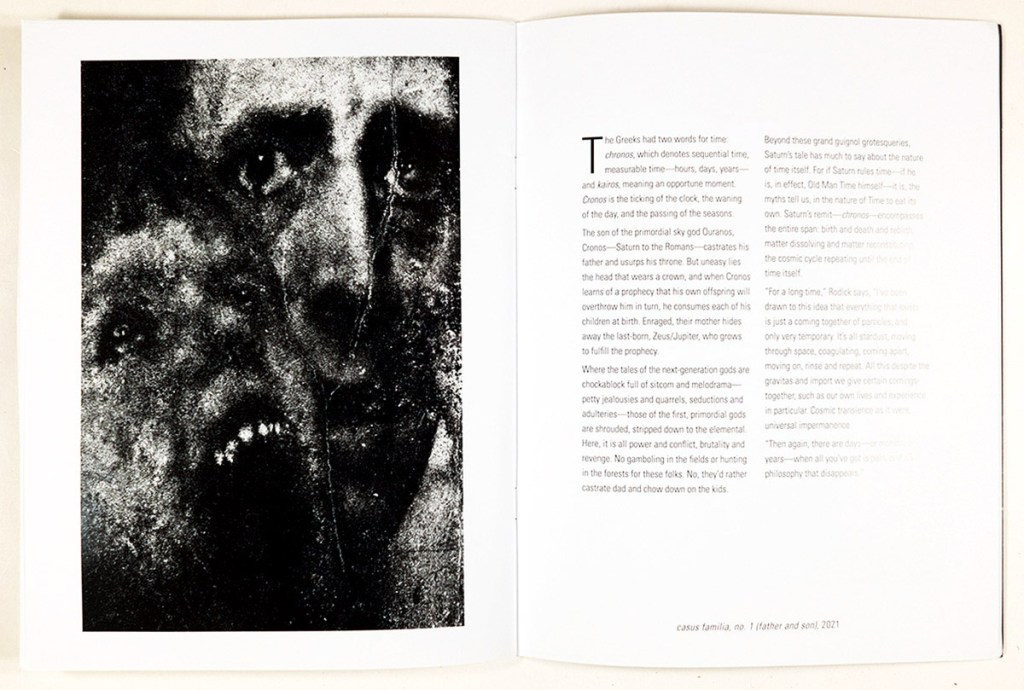Brokaw’s commentary (writes Rodick in a separate statement sent to me about the work) “evolved from [their] correspondence.” Brokaw’s essays (presented in seven separate fragments distributed through the book) is trenchant and engaging and, I feel, best approached as a correspondence, part of a three-way conversation along with the images themselves and the short, orienting descriptions of the photographic subjects written by Rodick. But there is an enigma central to The Moons of Saturn that the texts and images revolve around: what is at the elusive core, what sets this enigma in motion?