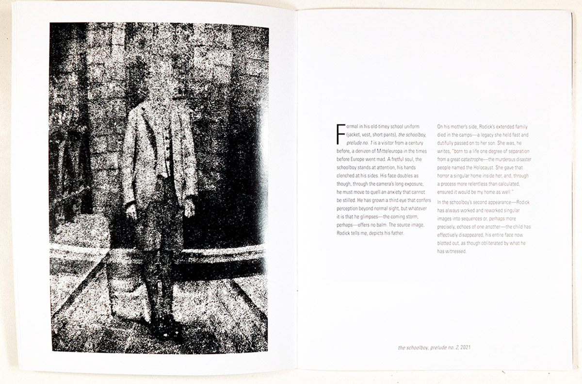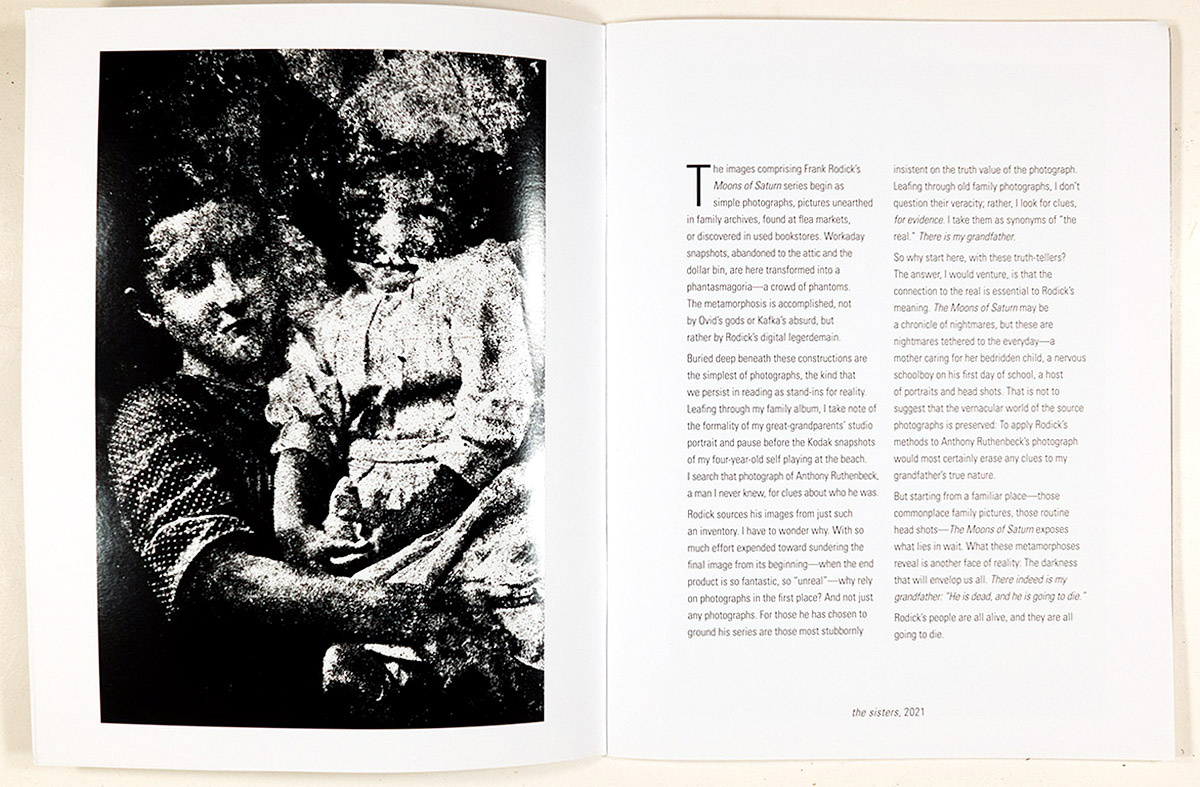 And like the moons of Saturn, as viewers of the disintegrating, impenetrable images Rodick presents us, we are endlessly drawn in to a place of seeing but not knowing, hovering on the surface of the impenetrable. Who are these people rescued from oblivion, preserved only to yet remain inaccessible in the photographic void? Rodick gives us a kind of aposiopesis, an inability (or unwillingness) to proceed further, leaving out what is most important and quite likely unknowable. At the center then we are confronted with what is not there, absent yet somehow still remaining. The mystery at the center of photography.