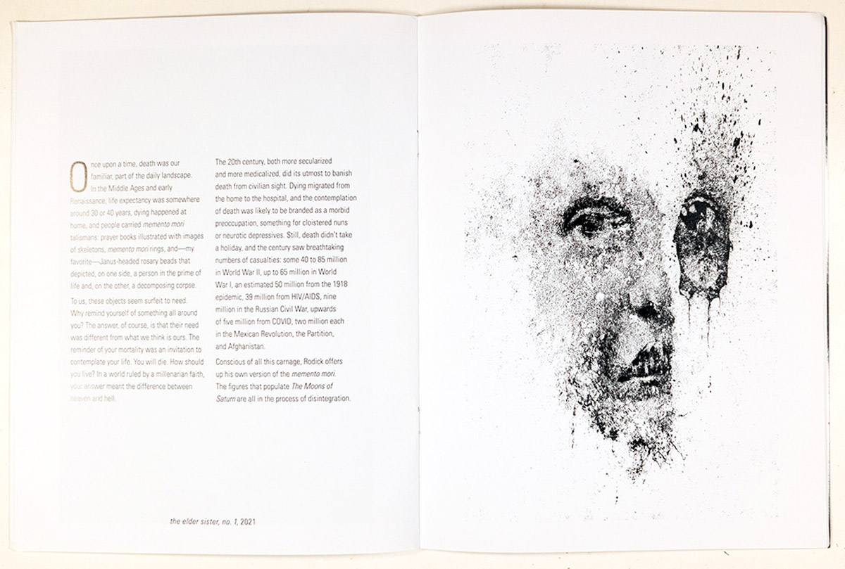 Brokaw’s commentary (writes Rodick in a separate statement sent to me about the work) “evolved from [their] correspondence.” Brokaw’s essays (presented in seven separate fragments distributed through the book) is trenchant and engaging and, I feel, best approached as a correspondence, part of a three-way conversation along with the images themselves and the short, orienting descriptions of the photographic subjects written by Rodick. But there is an enigma central to The Moons of Saturn that the texts and images revolve around: what is at the elusive core, what sets this enigma in motion?