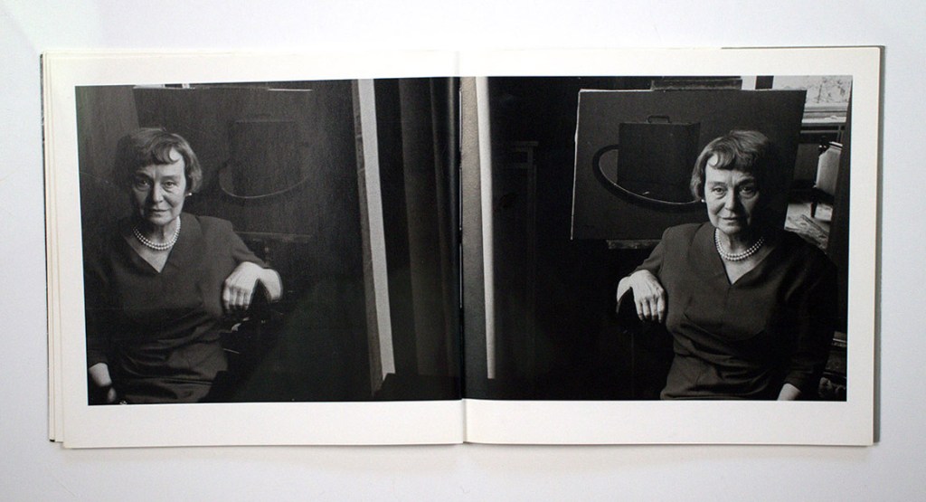The images transition back to black and white with a closeup of a bookcase. After a couple more page spreads with more variations of Magritte – front and back, plus double exposures of him and his easel – Magritte’s wife Georgette appears, sitting behind him. Next we see two almost identical photographs of her, then two spreads with details of paintings and bibelots.