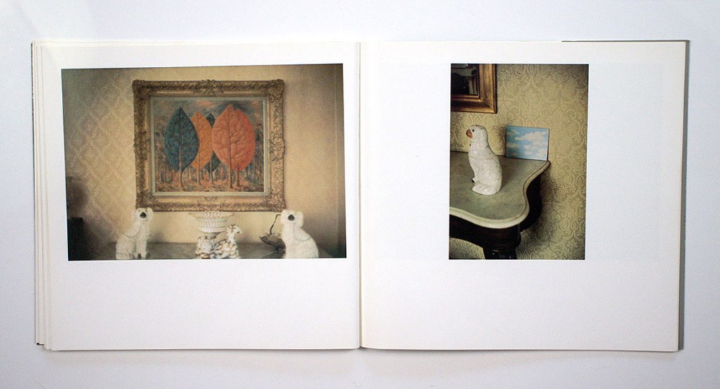 Michals doesn’t simply document his visit but rather uses the book form to create a visual representation of it for the viewer to experience. Only a few of the photos in A Visit With Magritte could be considered worthy of consideration as stand-alone images. Most are unremarkable shots of Magritte and his house from outside and inside. In fact, it seems that Michal’s visit was a formal one and he visited only Magritte’s sitting room, studio, and garden. Roughly half of the images are in color. They are mostly unmannered straight-on pictures that could be used as mug shots or catalogue illustrations; nothing about them suggests art.