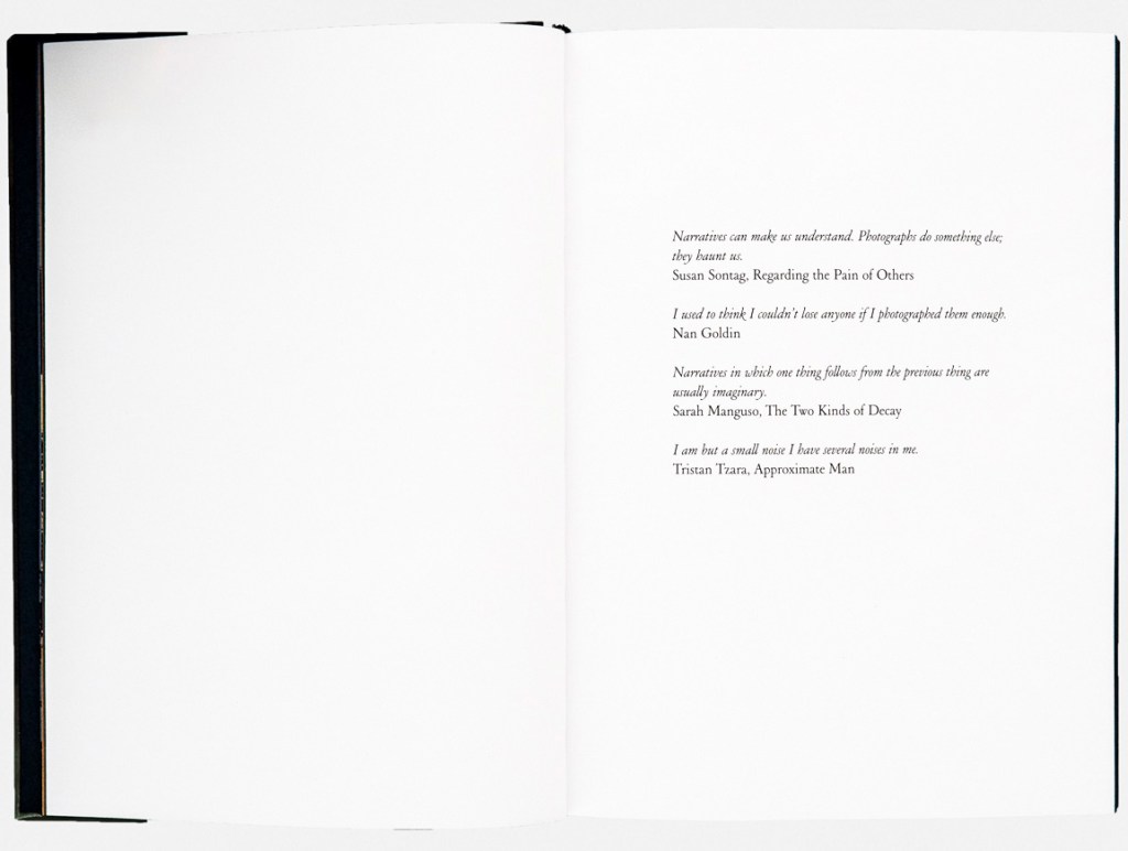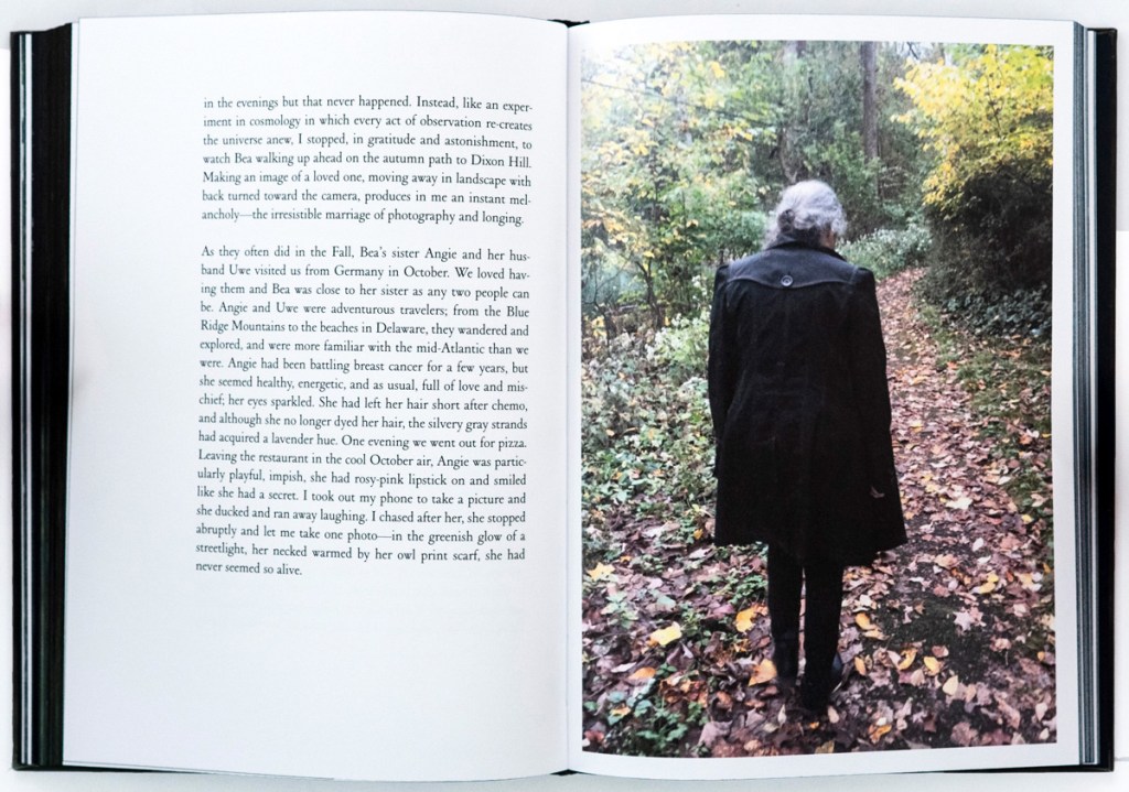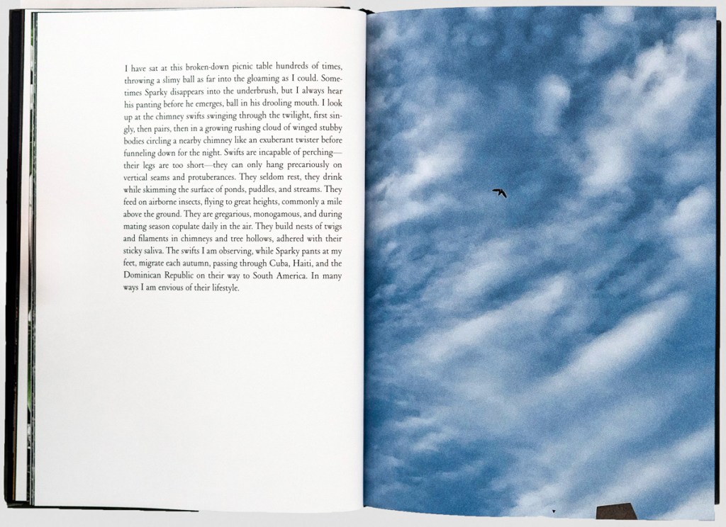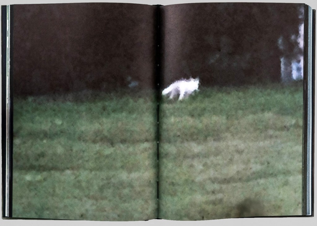 Visually, the book is as carefully composed as its prose. Measuring 8” X 6” with 176 pages—59 of them color photographs—it is elegantly designed, alternating between white text on midnight blue paper and black text on white. The darkened edges give the book a sense of containment, as if it were a small box of secrets, an effect Durant himself notes. The images serve as thematic markers, framing the narrative within the shifting light of morning and evening, with the sighting of the white fox and Durant’s hospitalization forming the emotional and narrative core of the book.